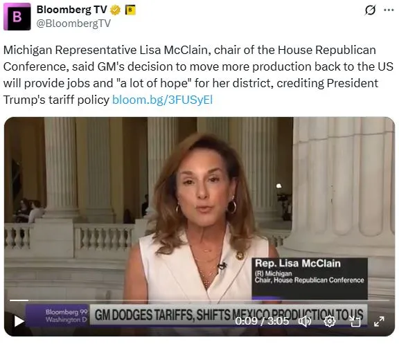 今日下午1點彭博電視台《權力平衡》早間版中,主持人喬·馬修與凱莉·萊茵茨採訪了密歇根州眾議員、眾議院共和黨會議主席麗莎·麥克萊恩,探討通用汽車將部分生產轉回美國及特朗普關税政策的影響。