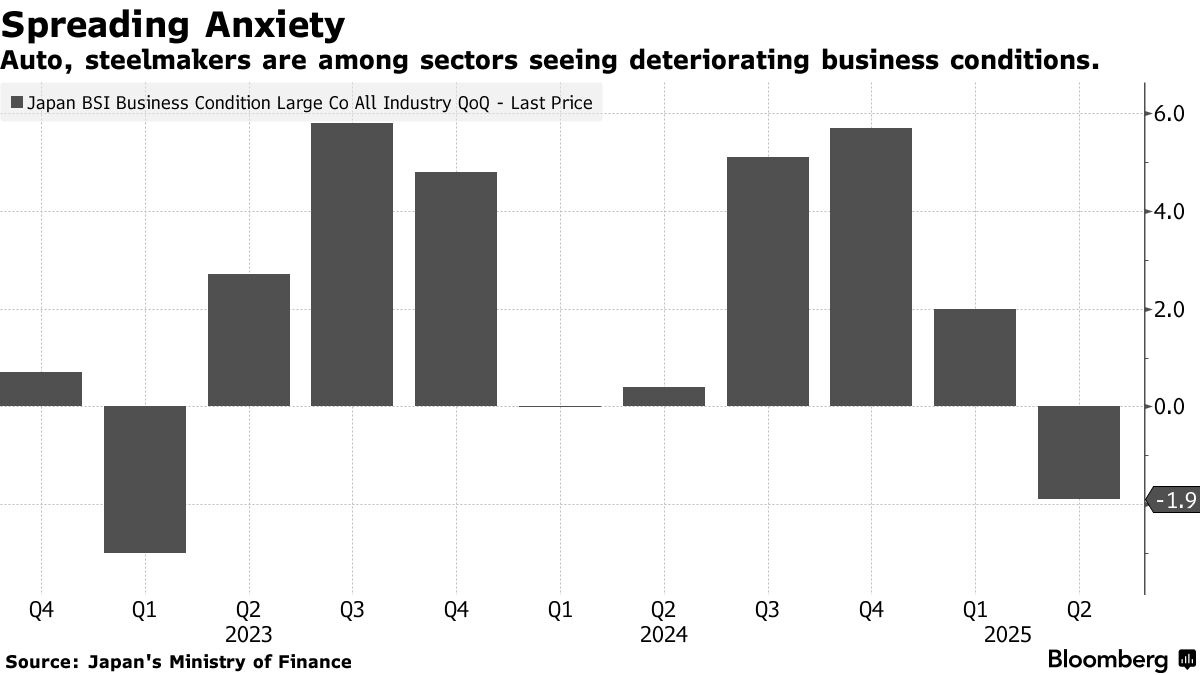 根據週四公佈的財務省調查,4-6月季度大型企業商業信心指數錄得-1.9,自2024年一季度以來首次跌入負值區間。負值表明報告經營狀況惡化的企業多於改善的企業。