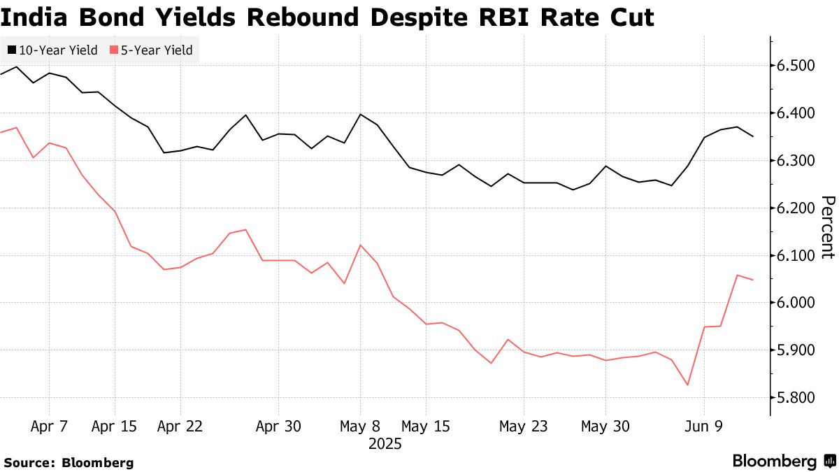 本週五年期和十年期國債收益率分別躍升逾20個基點和6個基點,逆轉了本季度部分跌幅。此前印度儲備銀行上週意外將政策立場從寬鬆轉向中性,並警告稱進一步寬鬆的"操作空間非常有限"。