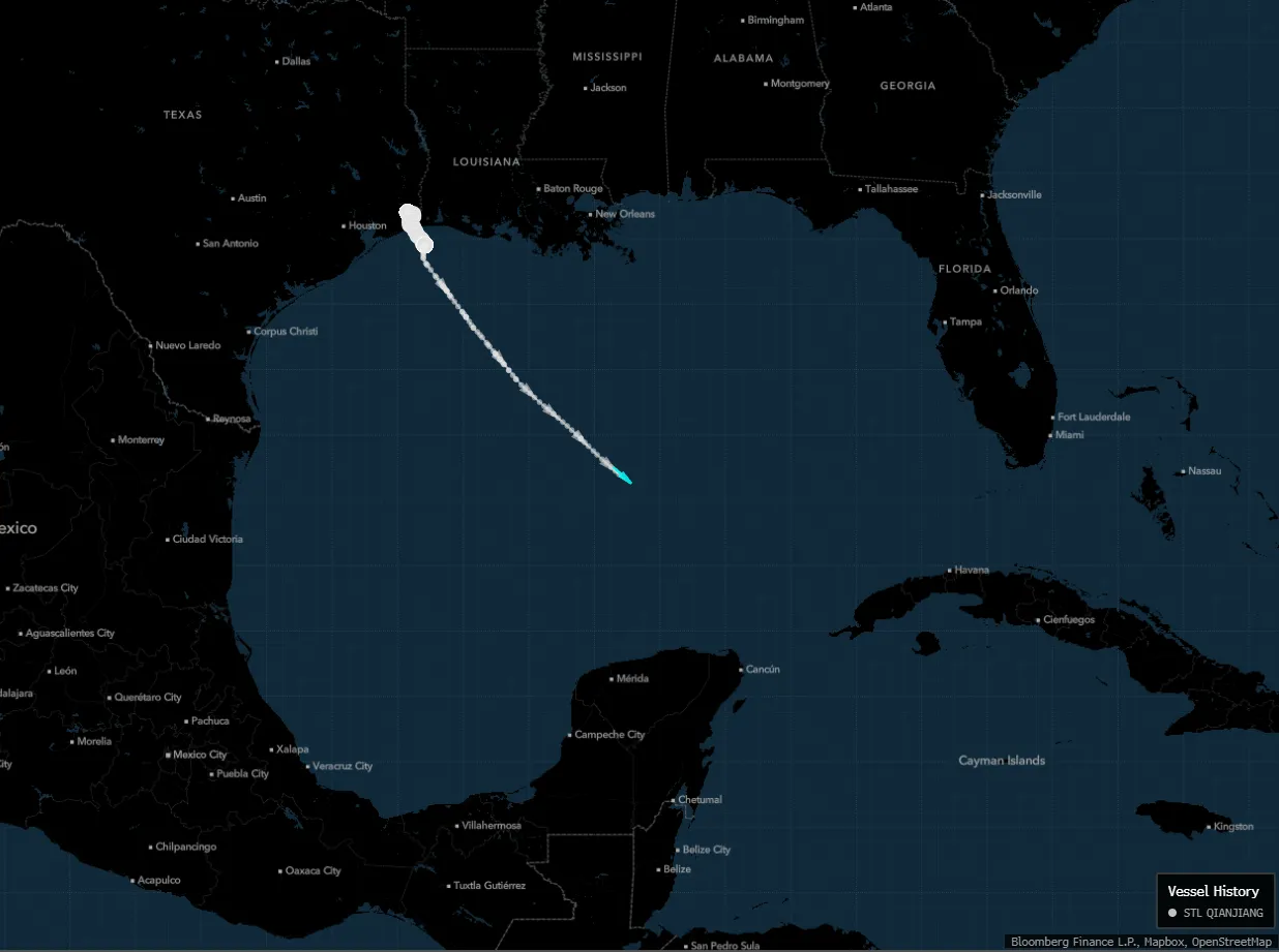根據彭博彙編的船舶追蹤數據,“STL錢江號"正駛向印度西海岸的達赫傑港。沃泰克思有限公司數據顯示,該船此前在能源轉移公司運營的德克薩斯州尼德蘭碼頭完成裝貨。
