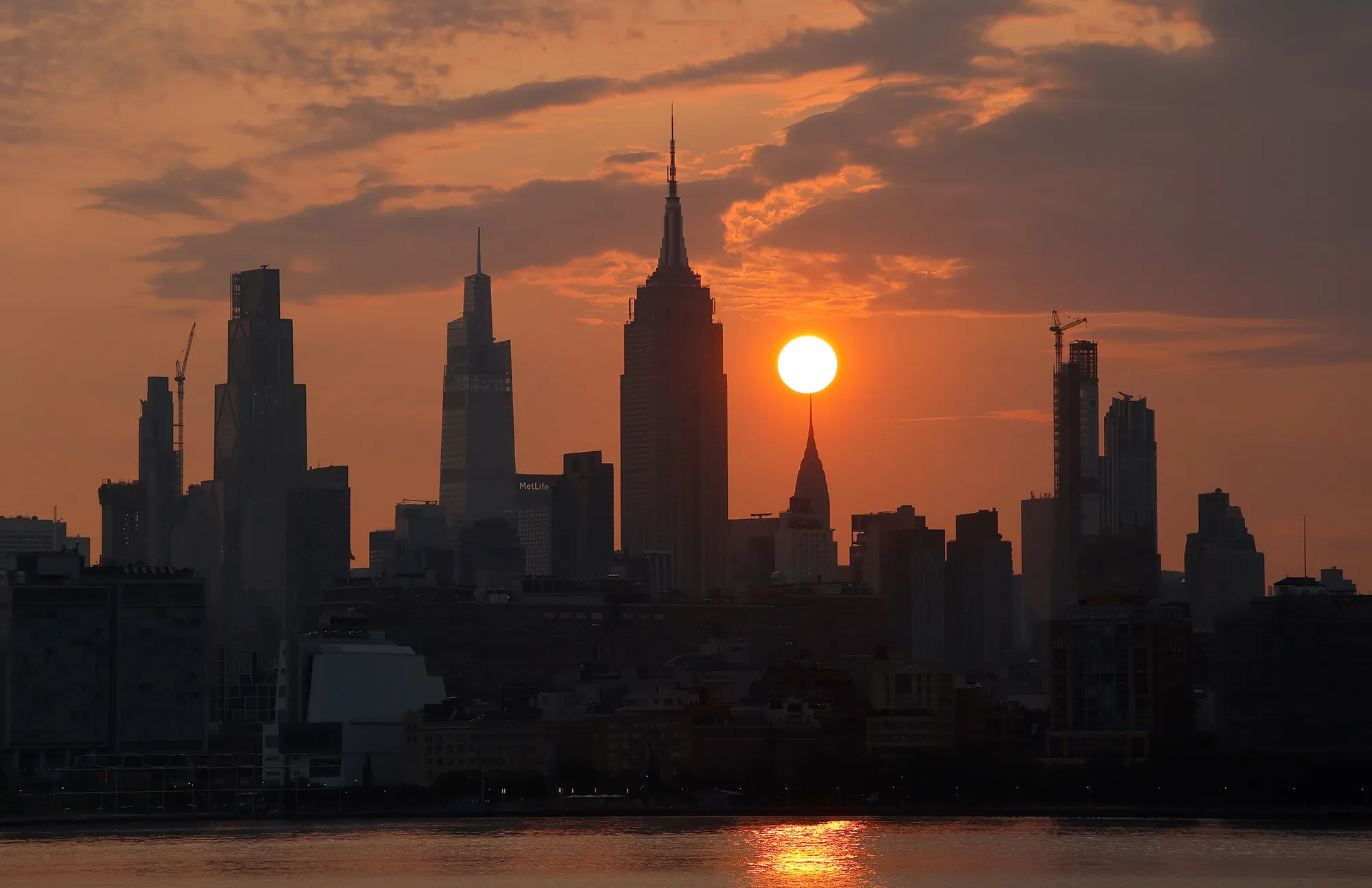 6月11日,紐約市天際線後方,加拿大野火產生的煙霧籠罩了太陽。