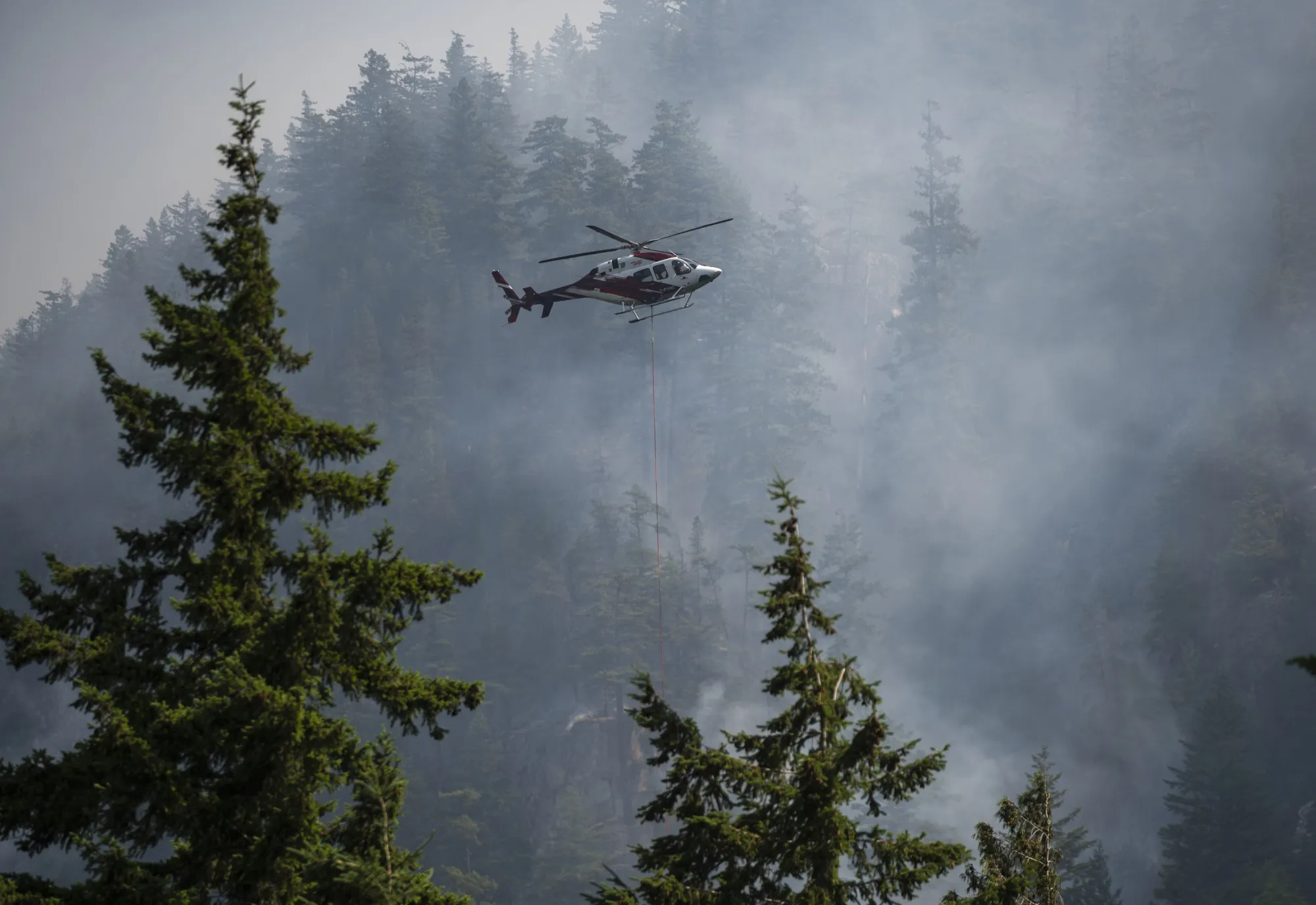 6月11日,一架直升機正在卑詩省斯闊米什以北的Dryden Creek野火區域實施空中灑水作業。攝影師:Tijana Martin/加拿大通訊社/美聯社預計週四美國大平原和中西部地區(包括俄亥俄州、印第安納州部分地區)以及加拿大西部和中部部分地區的空氣質量將惡化。