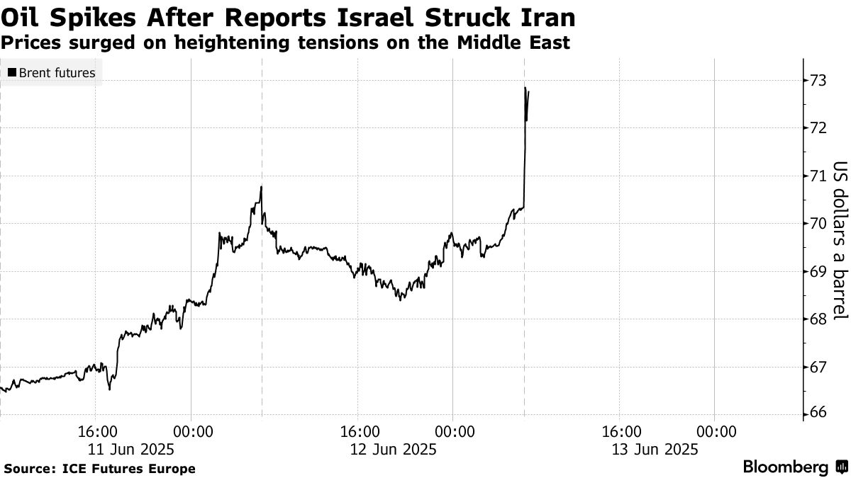 以色列對伊朗境內目標實施空襲後,油價飆升,引發市場對佔全球原油產量三分之一的中東地區爆發新衝突的擔憂。