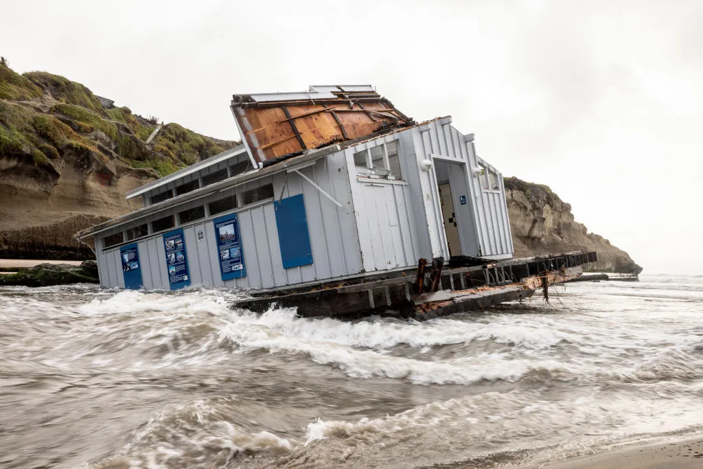聖克魯茲碼頭的公共廁所被衝上附近海灘。斯蒂芬·拉姆/《舊金山紀事報》通過蓋蒂圖片社/赫斯特報業/赫斯特報業這次坍塌由可能高達30英尺的巨浪引發,距離前一年冬季風暴損毀同一段碼頭僅隔一年(而那次風暴又是在蒙特雷灣遭遇更早一次冬季風暴的一年後發生的)。施工設備和工人當時正在進行修復工作。過去十年間,聖克魯茲市一直計劃對碼頭進行升級改造,包括在坍塌區域建造一座"地標性"建築。如今,就連耗資1400萬美元單純修復碼頭缺失部分的方案也引發了爭議。