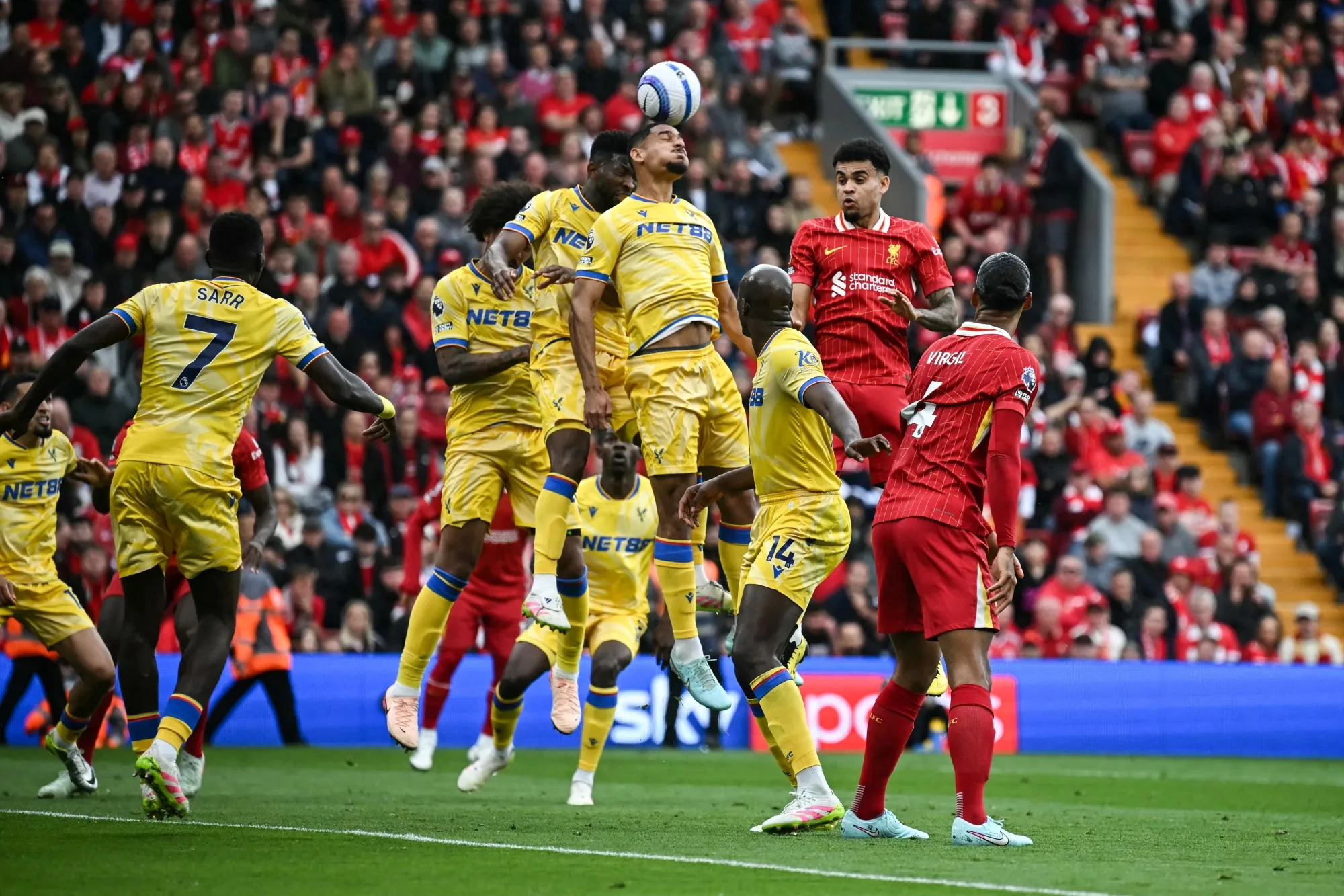 2025年5月25日,英格蘭利物浦,水晶宮中場球員傑弗裏·施魯普在利物浦對陣水晶宮的比賽中頭球爭頂。