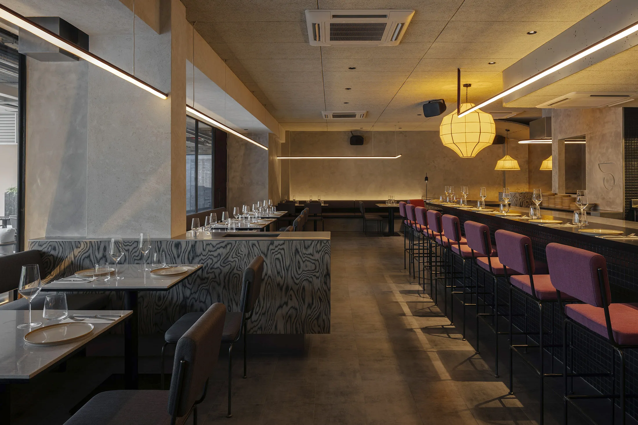 One Prawn & Co.自稱現代亞洲海鮮燒烤餐廳,官網標語"專注海鮮事業"。食客進門首先映入眼簾的便是熟成海鮮展示櫃——如同高檔牛排館處理紅肉般,整條優質海魚懸垂其間進行熟成。**氛圍。**餐廳坐落於羅伯遜碼頭附近的新餐飲商業區New Bahru。數月前該區域多數店鋪尚未入駐時還略顯冷清,如今連週日深夜都人聲鼎沸。餐廳採用灰黑主調的雅緻裝潢,中央長條形吧枱提供板前座位。