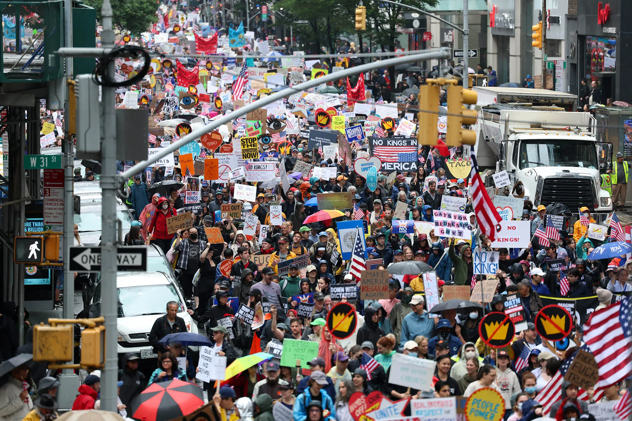 紐約市“不要國王”抗議活動中的示威者。攝影師:查理·特里巴洛/法新社/蓋蒂圖片社“讓我們向世界展示洛杉磯和我們國家最好的一面,”洛杉磯市長凱倫·巴斯在抗議活動開始時表示。“讓我們與挑釁、升級和暴力形成鮮明對比。”