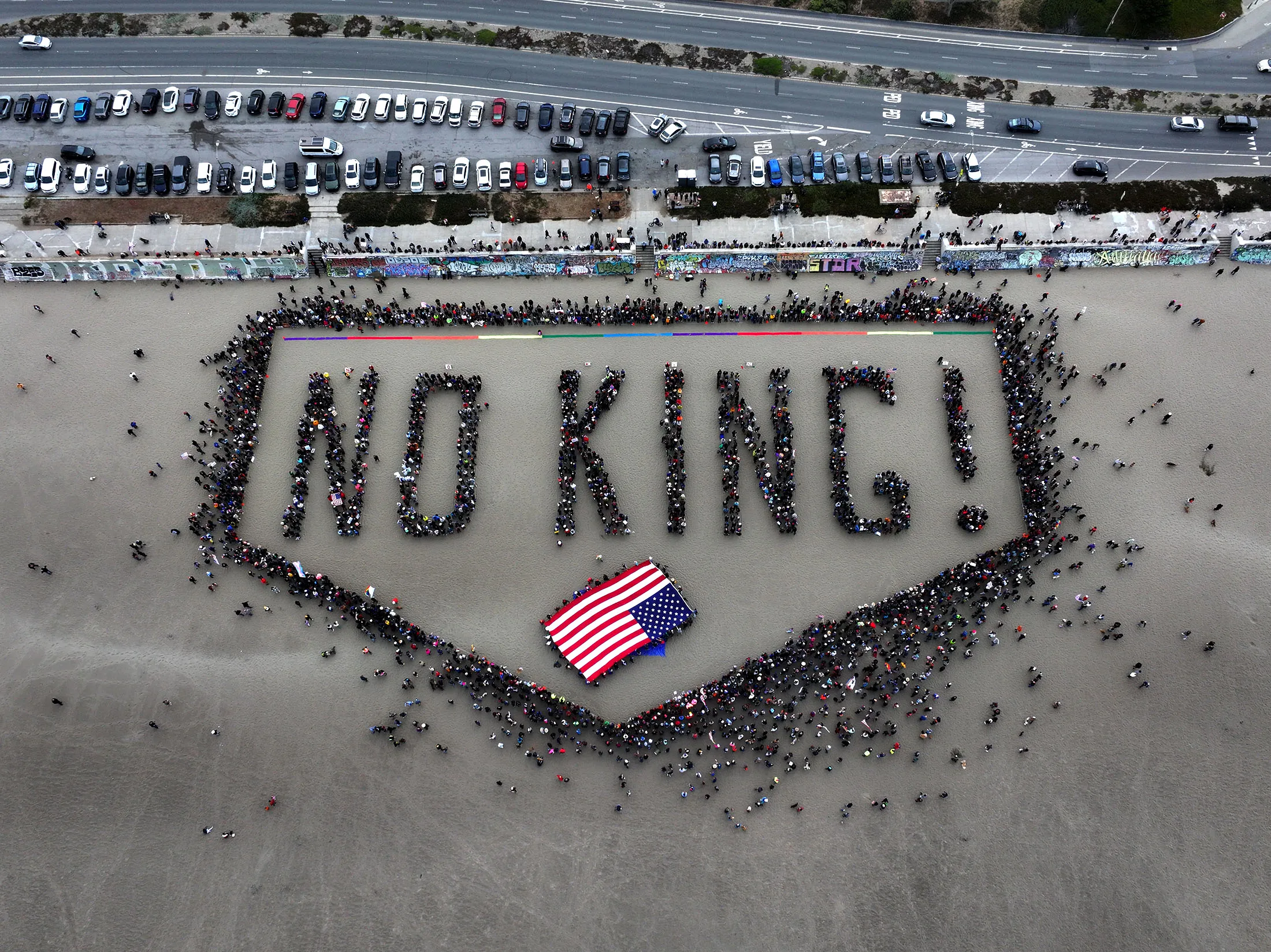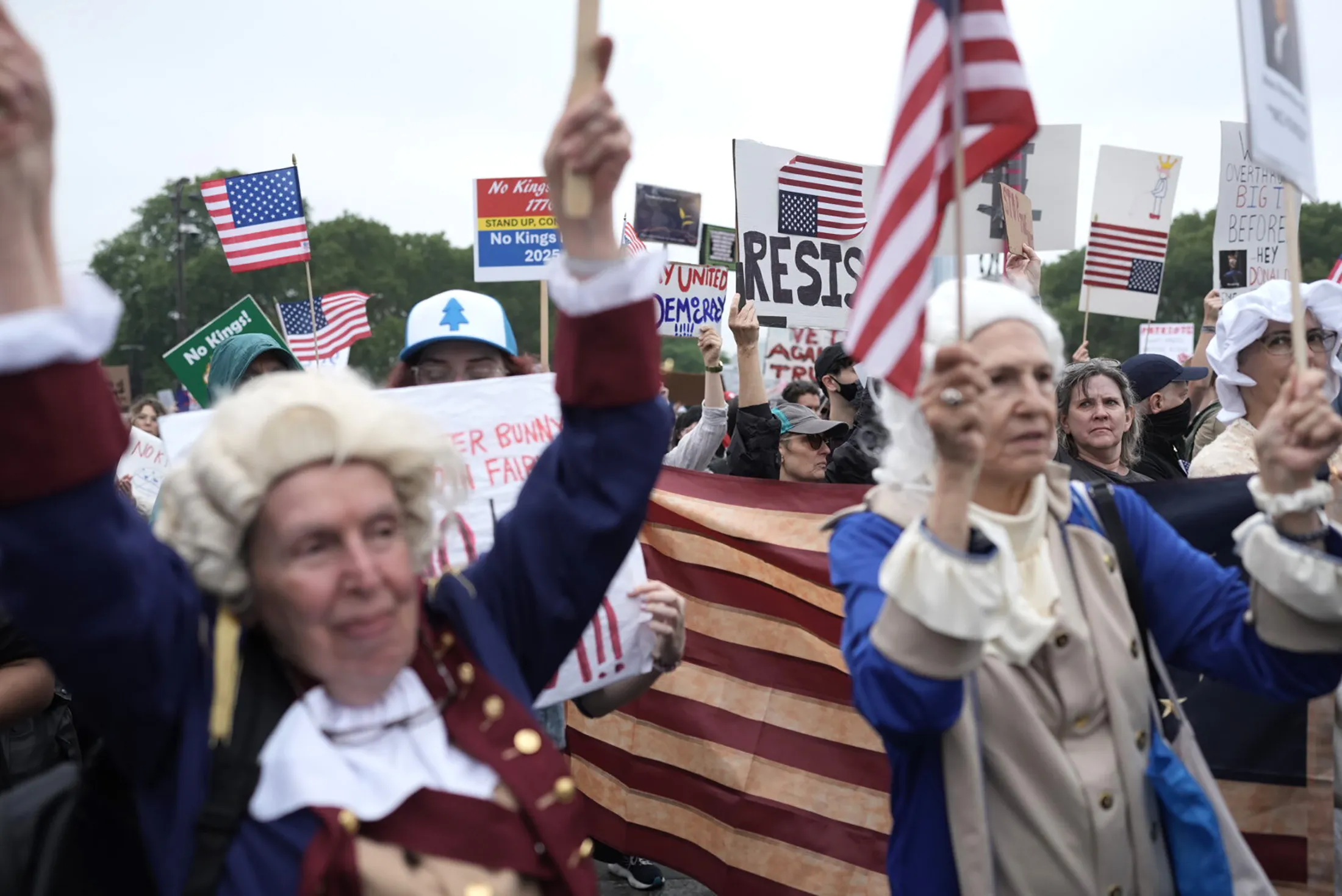 包括民權組織和工會在內的反特朗普活動人士以"不要國王"為口號組織全國性抗議,譴責他們所稱的特朗普獨裁傾向——以及在其79歲生日當天舉行的閲兵式。