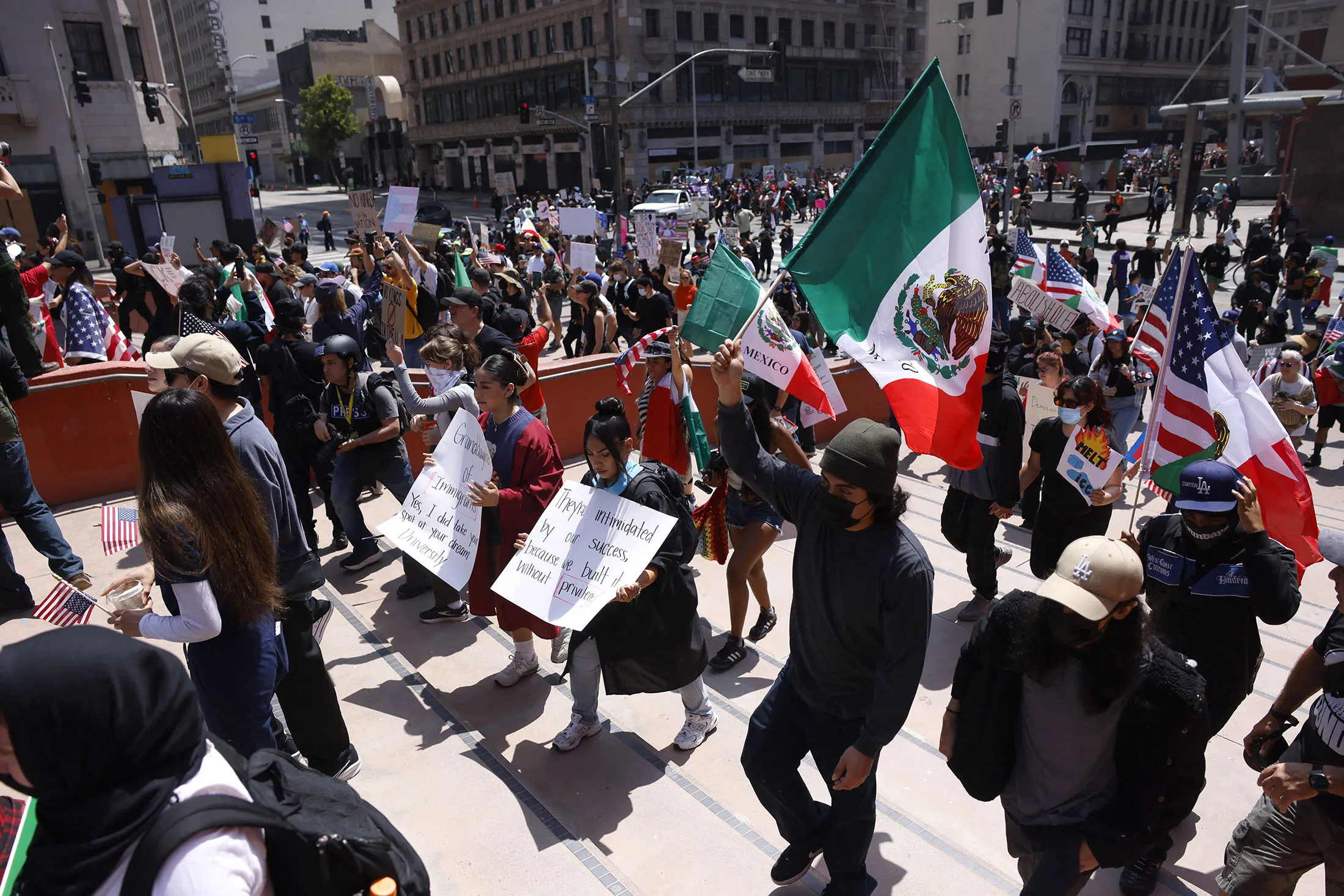 6月14日,洛杉磯市中心,示威者手持墨西哥和美國國旗。攝影師:Etienne Laurent/AFP/Getty Images