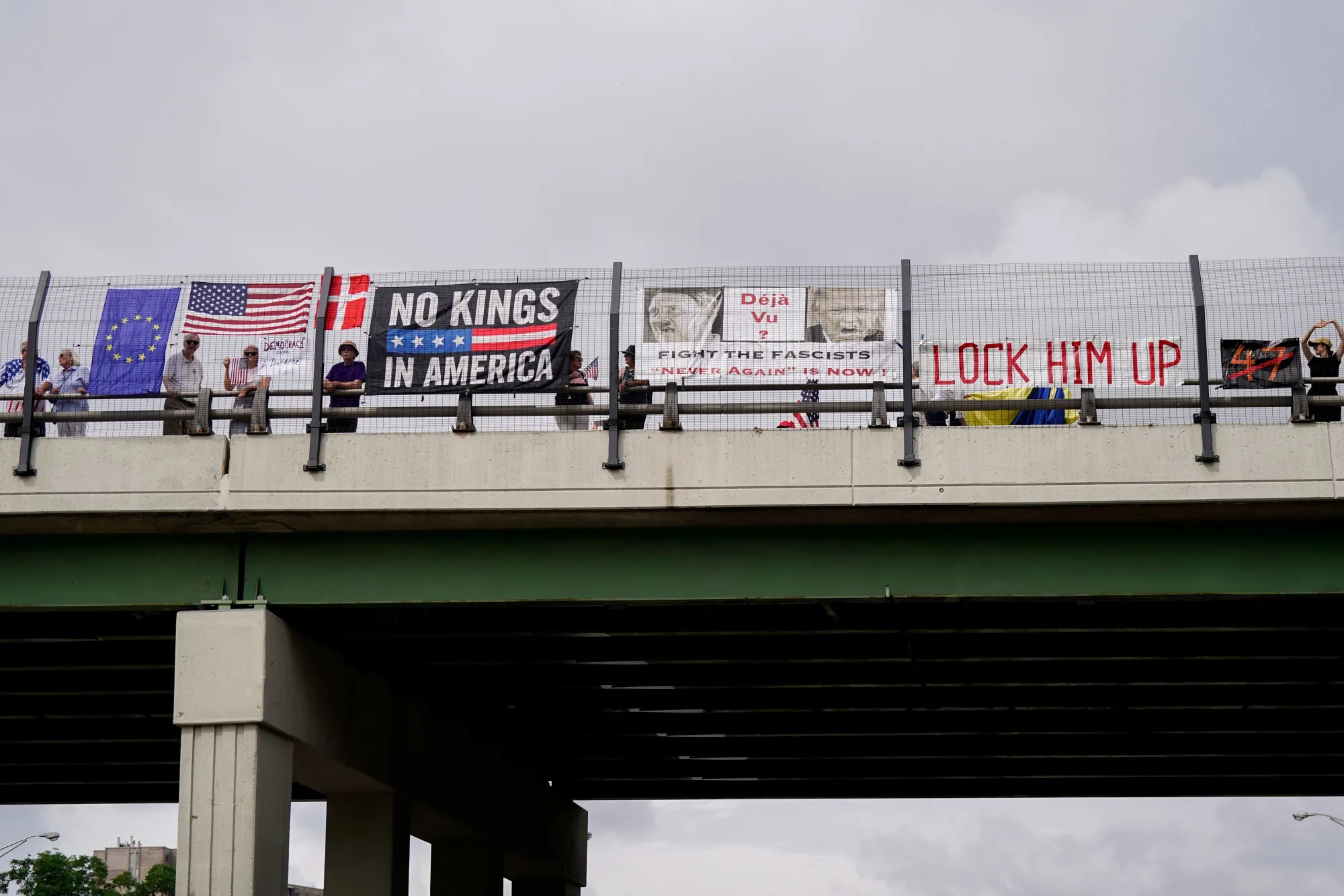 在美國陸軍250週年閲兵前,示威者在I-395公路天橋上展示標語。攝影師:肯特·西村/彭博社阿諾德表示,中東衝突無疑將成為主要討論議題,鑑於自由黨核心小組在該問題上的分歧,卡尼需要謹慎應對。
