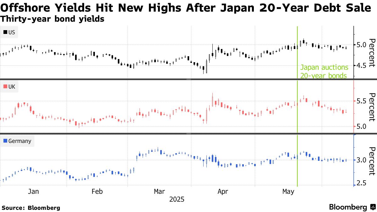 在五月下旬日本市場最引人注目的交易日之一,20年期國債拍賣遇冷導致東京超長期收益率飆升後,美國30年期國債收益率創下19個月新高,而德國同期國債收益率也升至兩個月高點。
