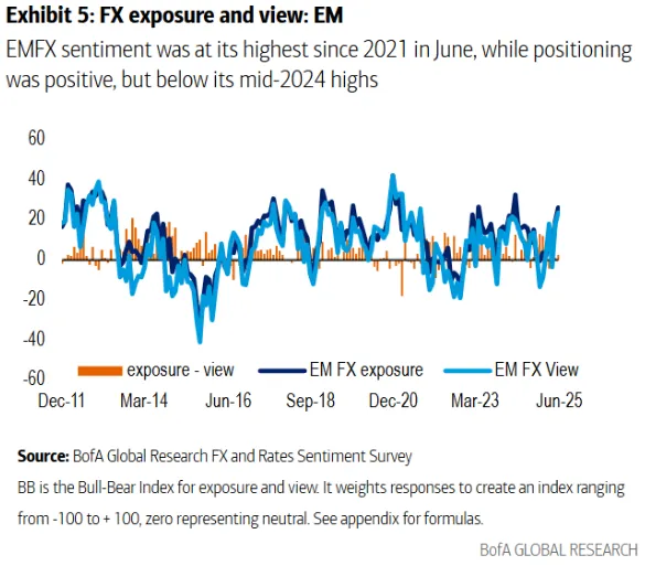 來源:美國銀行美銀的新興市場外匯情緒指標已升至2021年美聯儲啓動緊縮週期前的最高水平。Preusser指出,當前倉位仍低於美國大選前水平,表明新興市場反彈仍有延續空間: