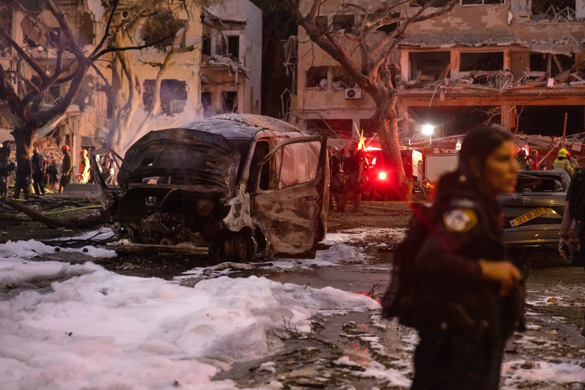 週一,特拉維夫一棟遭彈道導彈襲擊的建築外,一名警察正在執勤。