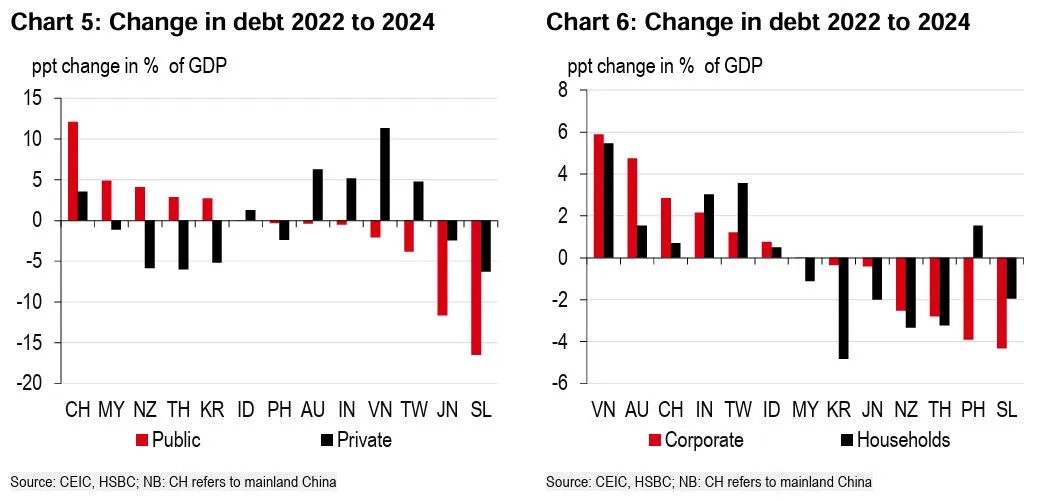 “許多地區的債務水平仍然很高,但近年增速已放緩,且自2022年以來日本、斯里蘭卡、泰國、菲律賓和韓國等主要經濟體的債務與GDP比率甚至出現下降,“滙豐銀行亞洲首席經濟學家弗雷德里克·紐曼與同事阿班提·鮑米克寫道,“中國大陸是唯一公共和私人債務佔GDP比重均有所上升的經濟體,不過由於消費者槓桿率下降,公共債務增幅遠高於私人債務。”