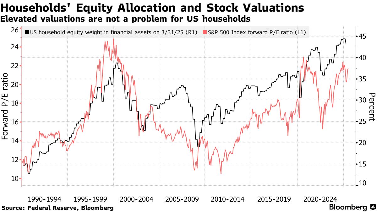 策略師補充道,當前美國家庭將49%的金融資產配置於股票,創歷史新高,超過了2000年48%的前峯值。他們指出,這是與其他地區的關鍵差異——歐元區家庭股票配置比例僅為10%,日本也只有13%。