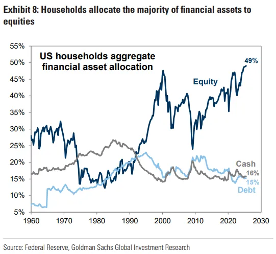 “家庭部門對股票需求的韌性至關重要,因為他們是美股市場最大的持有羣體,“科斯廷寫道,“美國家庭直接持有38%的美股份額,若算上通過基金間接持有的部分,其控制比例更高。”