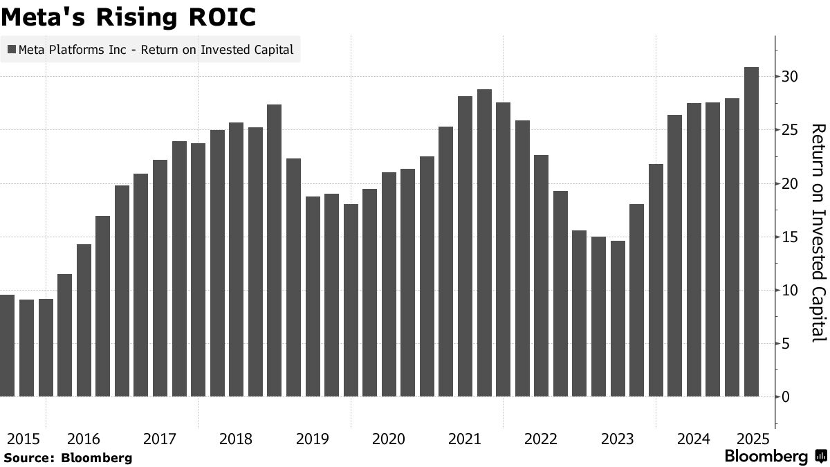 Meta一季度投入資本回報率創下31%的歷史新高,是2023年水平的兩倍多——當時該公司對元宇宙的雄心壯志推高了支出。