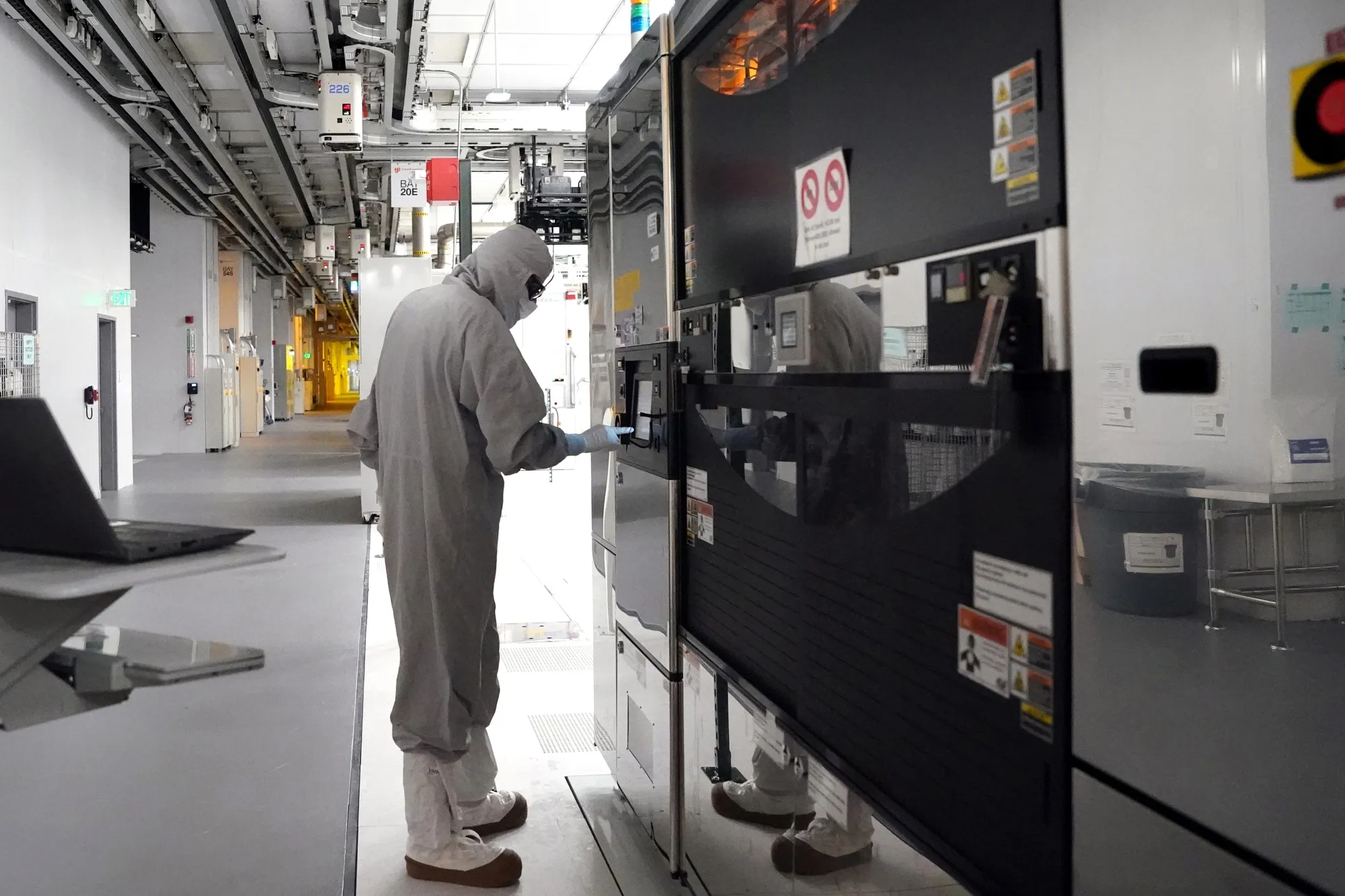 一名身穿無塵服的員工正在紐約州馬耳他市的半導體制造設施內進行維護作業。
