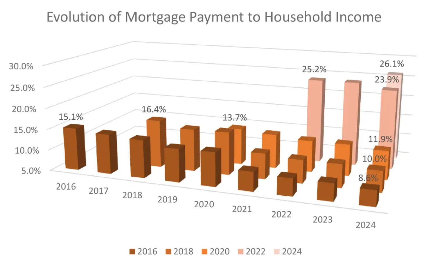 摩根士丹利摩根士丹利這確實引人注目。如果你在2018年鎖定了抵押貸款,那麼到2024年,你的月供僅佔你可能收入的10%(平均而言)。輕鬆。另一方面,2022年獲得抵押貸款的人每月支付的金額約佔其月收入的24%。