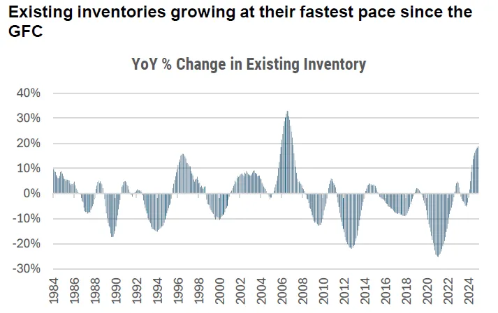 與此同時,我們談話的另一個重要主題是庫存的增加。幾年前,所有的討論都是關於沒有房屋出售。現在情況明顯下滑,待售庫存連續17個月同比增長。自大金融危機以來,我們還沒有見過這樣的增長。這是伊根上週的一份筆記中的內容。