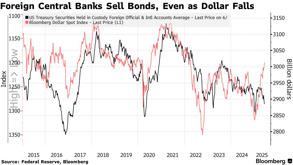 截至6月11日的一週內,全球央行和其他官方實體在紐約聯邦儲備銀行託管的美國國債減少了170億美元,自3月底以來的累計降幅達到480億美元。此外,外國機構在美聯儲逆回購協議工具中的持有量自3月底以來下降了約150億美元。