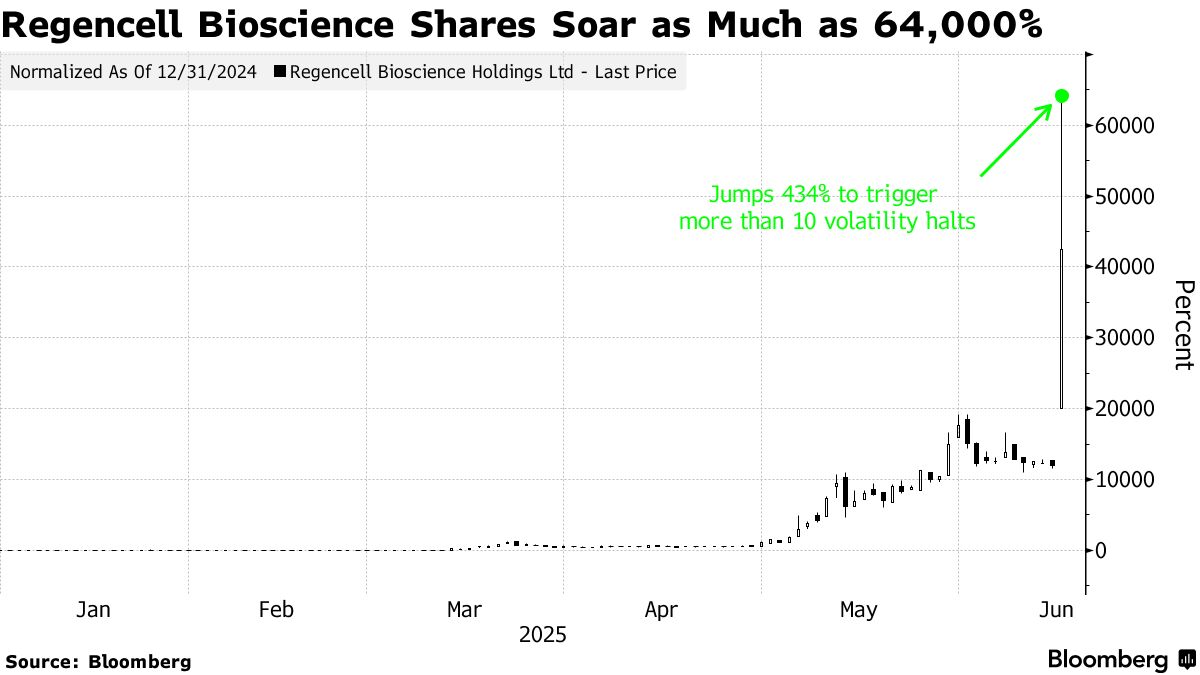 這場令人難以置信的暴漲讓Regencell Bioscience Holdings Limited(再生細胞生物科學控股有限公司)——這支四個月前還是仙股的股票——市值突破200億美元。一年前,其市值僅為5300萬美元。而該公司在截至2024年6月的財年淨虧損440萬美元,同比收窄28%。
