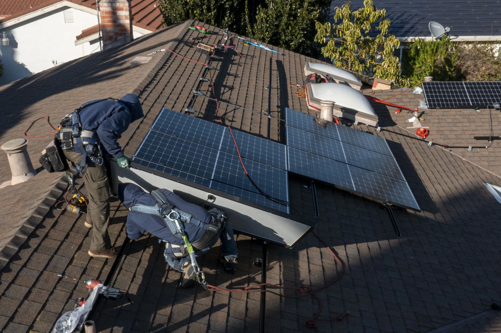 工人們正在加利福尼亞州聖何塞的一處住宅屋頂安裝SunRun太陽能電池板。