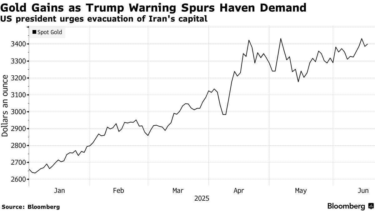 金價一度上漲0.4%,至每盎司3,400美元以上,此前週一下跌1.4%,為一個月來最大單日跌幅。特朗普在社交媒體上發文呼籲清空伊朗首都,幾小時前他曾敦促伊朗領導人簽署協議限制其核計劃。