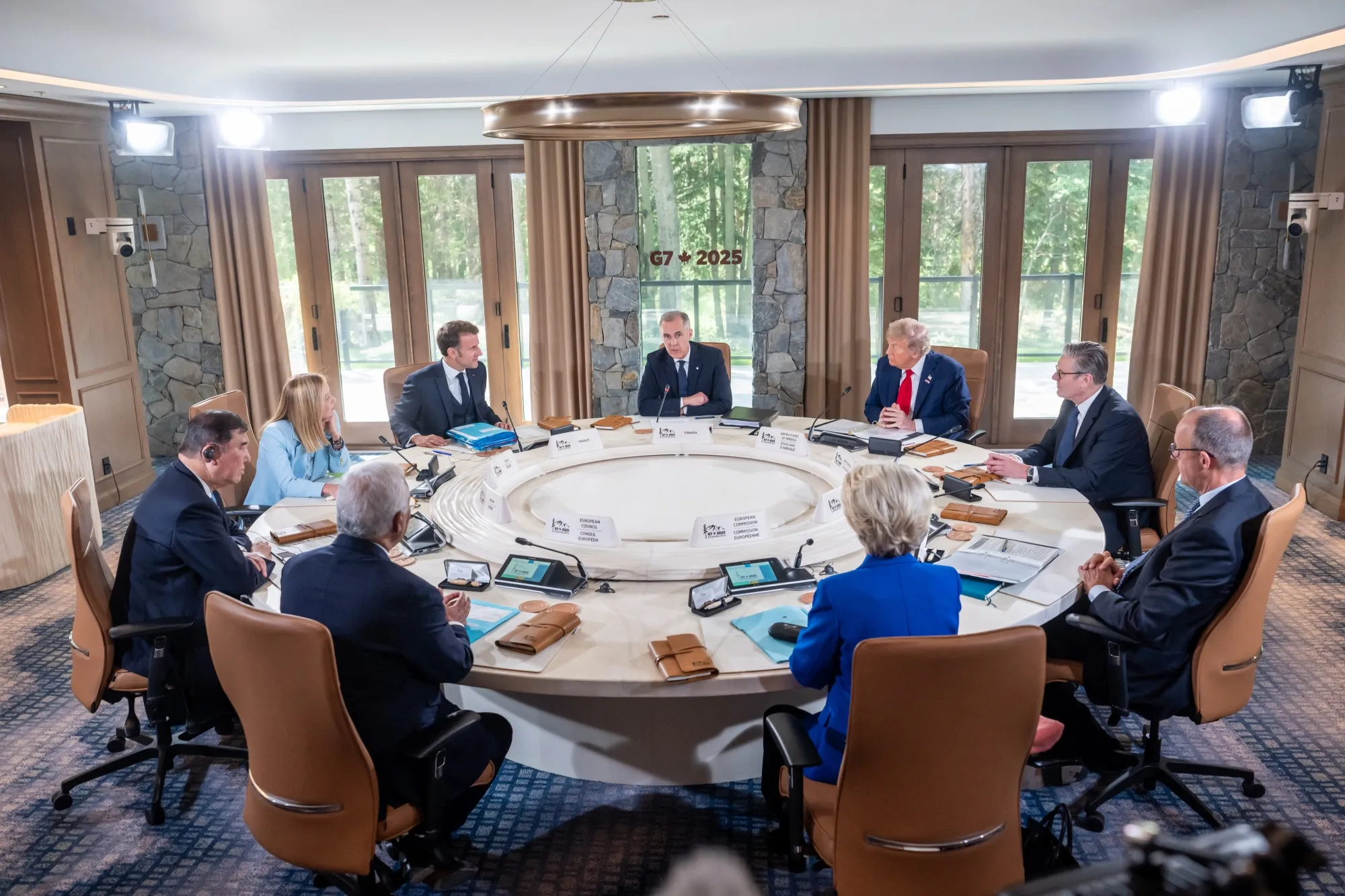 從左至右依次為石破茂、喬治婭·梅洛尼、埃馬紐埃爾·馬克龍、馬克·卡尼、唐納德·特朗普、基爾·斯塔默、弗里德里希·默茨、烏爾蘇拉·馮德萊恩和安東尼奧·科斯塔,他們於6月16日參加七國集團峯會的工作會議。攝影師:Michael Kappeler/Pool/Getty Images據一位不願具名的德國官員透露,在全球經濟展望會議上,成員國試圖讓特朗普明白,當前主要挑戰是七國集團成員相互對抗反而讓中國獲益。