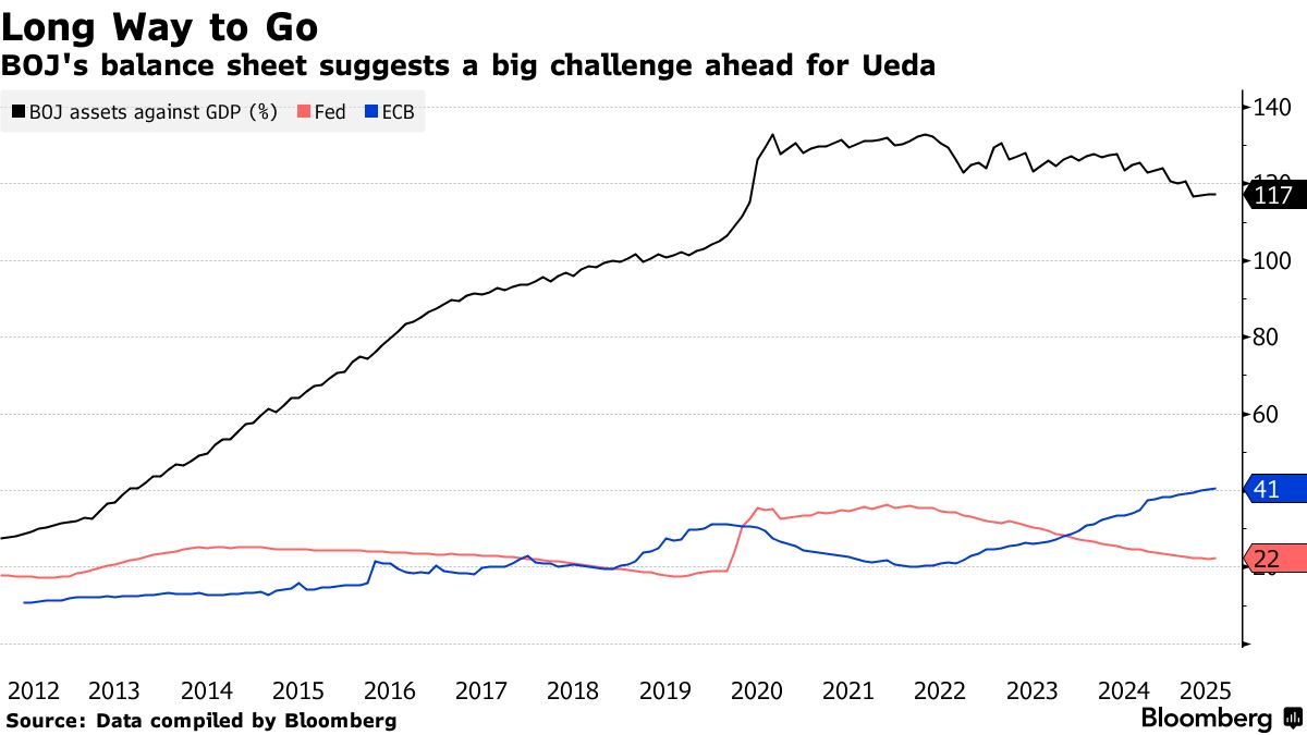 日本央行資產負債表規模佔國內產出的比例約為120%,遠高於美聯儲和歐洲央行相對於各自國家經濟的比例。