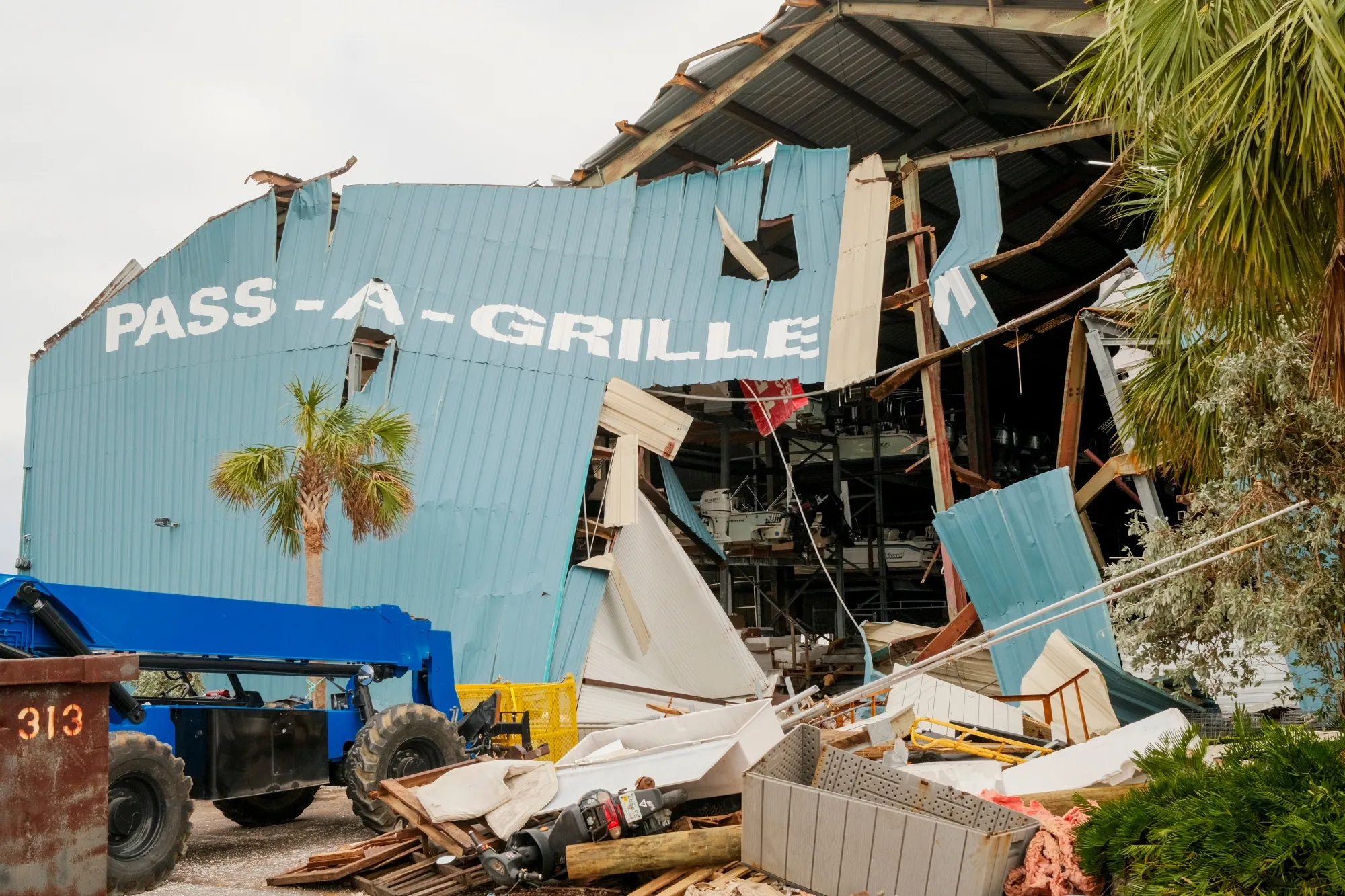 2024年10月11日,佛羅里達州聖彼得堡海灘一家餐廳遭颶風"海倫"和"米爾頓"破壞。