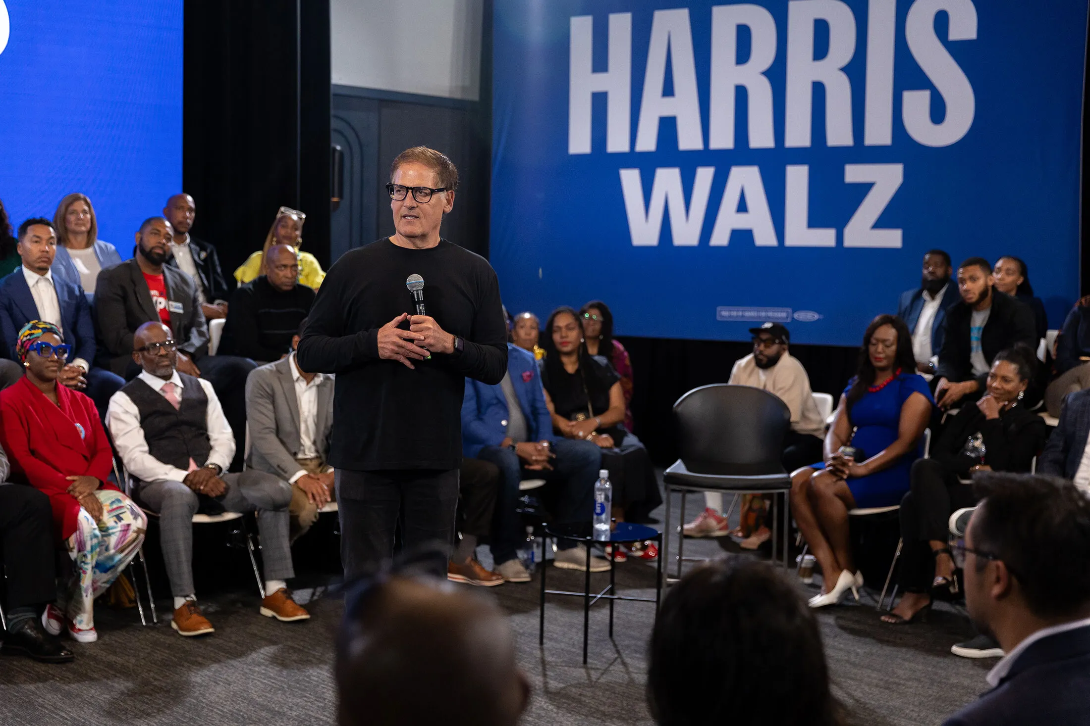 庫班在亞特蘭大市政廳回答提問,此次活動是哈里斯-沃茲競選活動的一部分。攝影師:內森·波斯納/阿納多盧/蓋蒂圖片社自稱獨立派的庫班在拜登退選後更深入參與競選,頻繁以卡瑪拉·哈里斯的競選代理人身份亮相有線新聞,甚至與她共同出席競選活動。在十月份威斯康星州的集會上,他將哈里斯的對手稱為"偷走聖誕的特朗普"和"格林奇”,因為庫班認為特朗普提出的關税政策會抬高玩具等消費品價格,毀掉節日氛圍。這番嘲諷如今看來頗具先見之明,儘管當時未受重視。對此他頗為惱火,不過對哈里斯的主要批評更為根本:“她不懂推銷之道,必須保持鬆弛開放的狀態。“換言之:哈里斯表現得不夠像馬克·庫班。