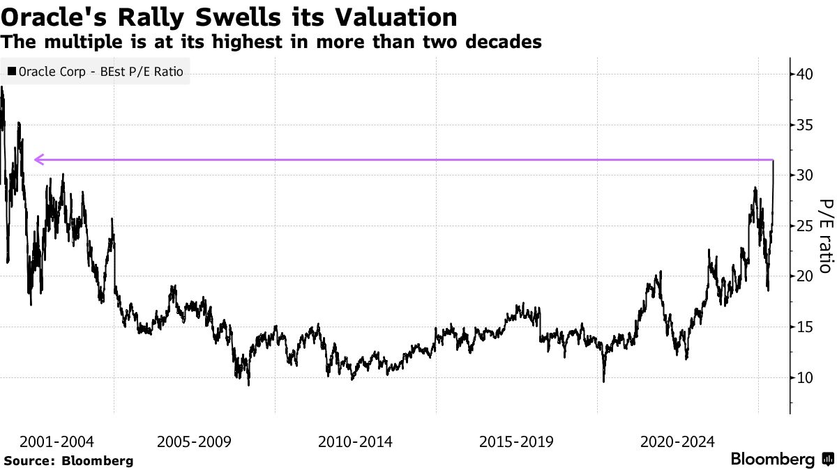 不過,當前增長預期仍落後於股價的飆升幅度,導致市盈率急劇膨脹。彭博數據顯示,基於未來12個月預期利潤的31倍市盈率,甲骨文股價已達2002年以來最高水平,較過去十年平均估值高出近一倍。
