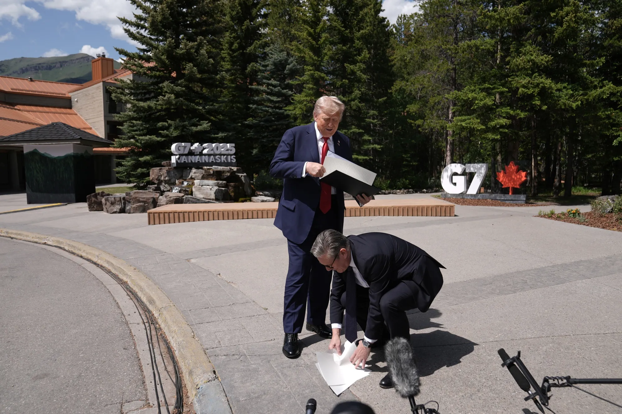 在卡納納斯基斯峯會上,斯塔默曾俯身為特朗普拾起一疊文件——這些紙張是總統簽署上月達成的貿易協定時不慎散落的。這個畫面成為峯會最令人難忘的瞬間之一。