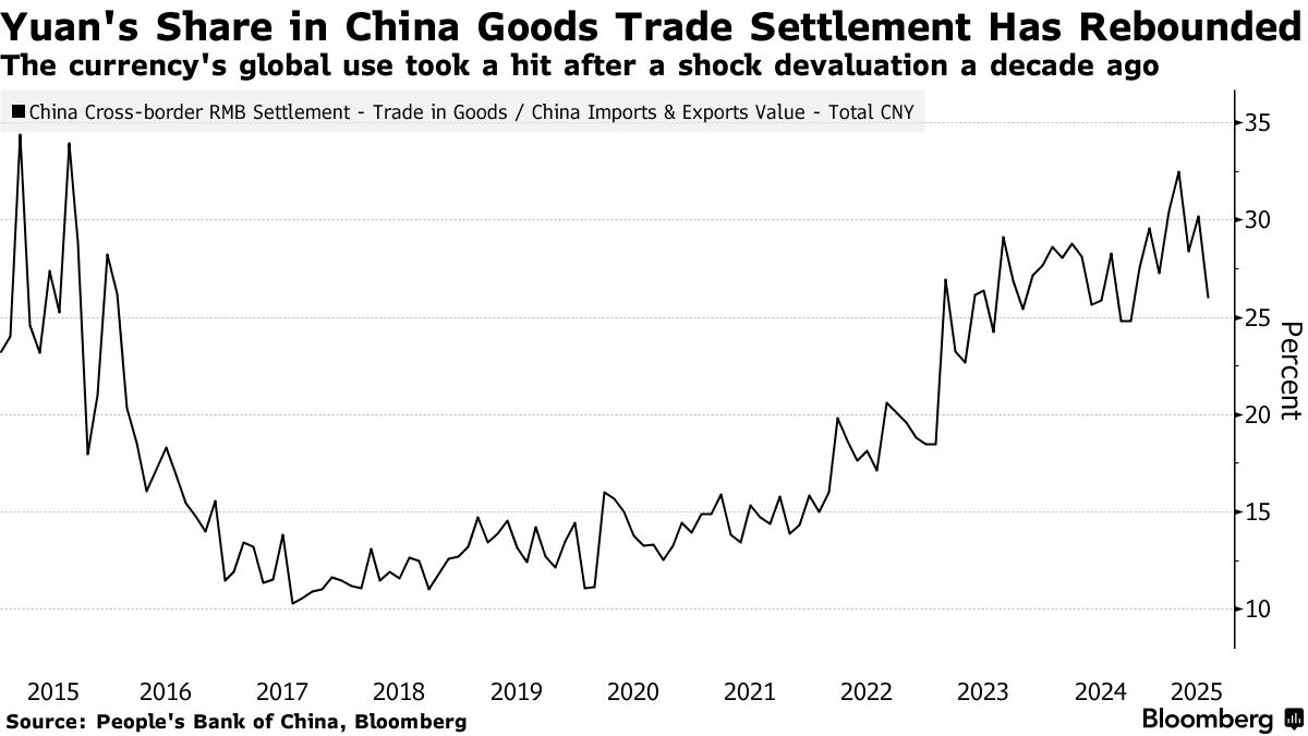 中國正推動人民幣與美元分庭抗禮。這是習近平主席將中國建設為金融強國戰略的延伸,旨在打造穩定性足以支撐其在國際貿易中發揮更大作用的貨幣,特別是在特朗普第二任期中美關係緊張之際。