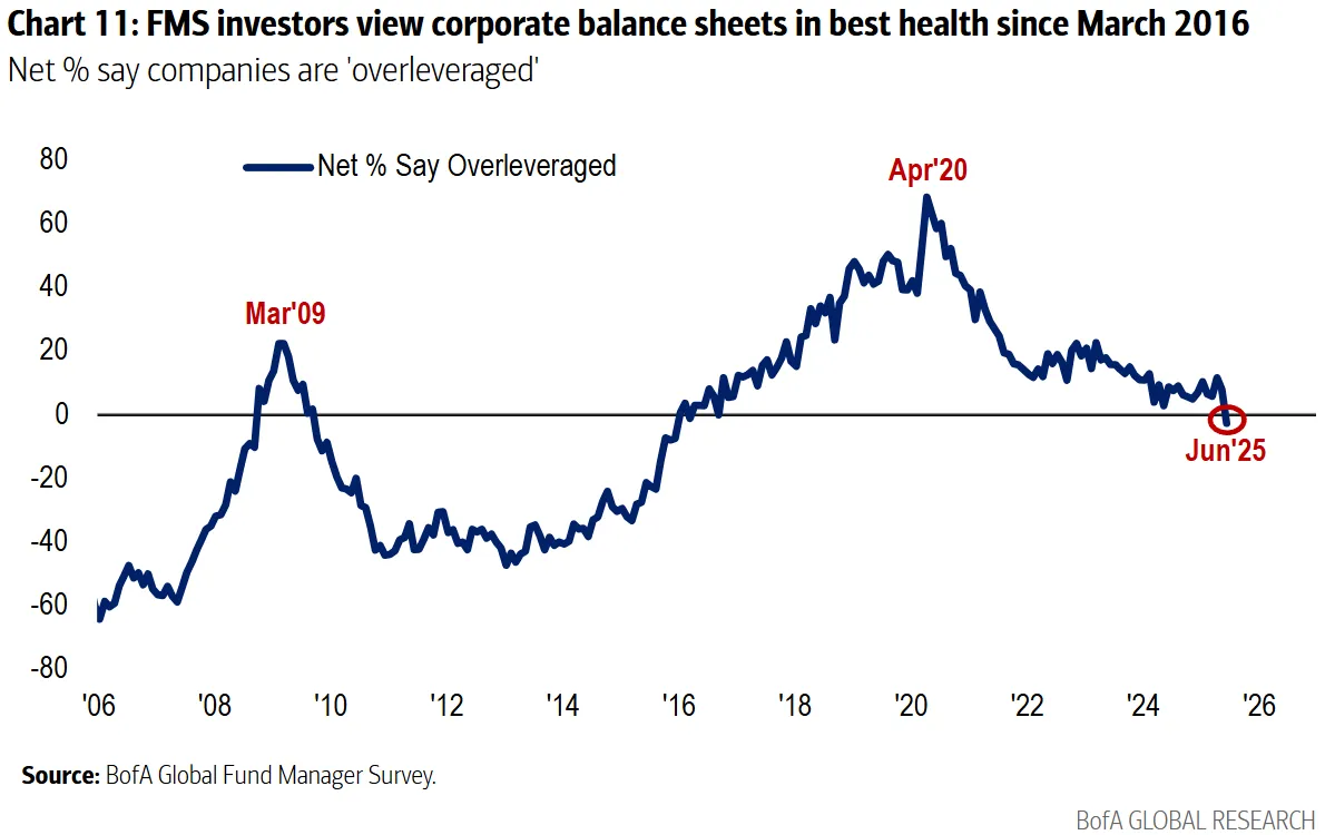 若這種樂觀情緒在全球動盪背景下顯得令人費解(即便調查進行時尚未開始轟炸伊朗),可從認為美國企業槓桿過高的投資者比例中找到線索——近十年來首次,微弱多數認為企業財務狀況良好: