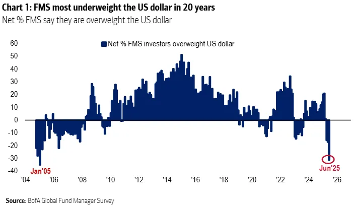關於歐洲終於能協調行動的這種集聚信心,也反映在投資者倉位的另一驚人變化中。美國銀行調查最重要的發現是:儘管政策反覆,但市場仍普遍認為美元將走弱。資產配置者目前對美元的配置比重已降至20年來最低水平。這暗示着對歐美兩地的判斷: