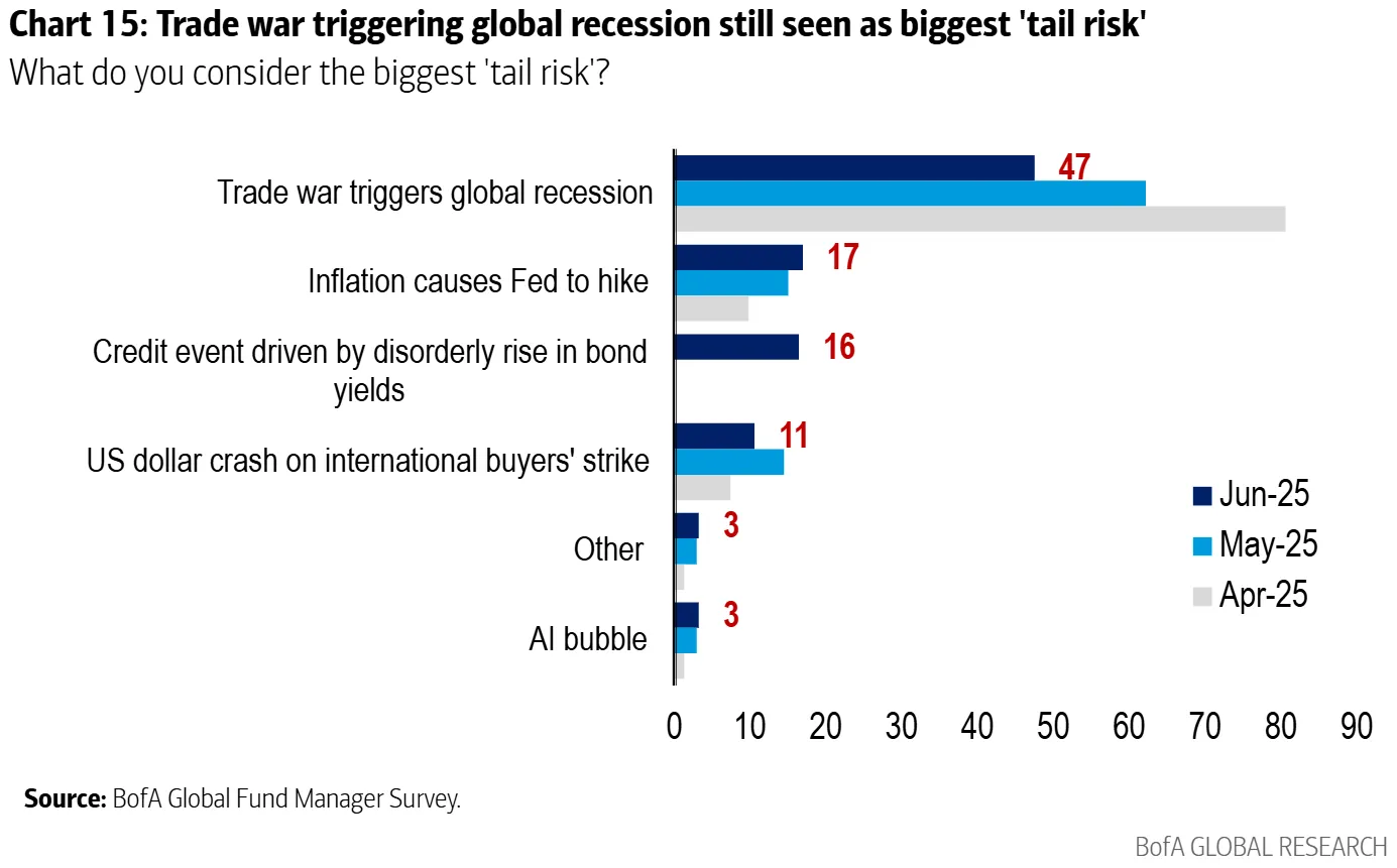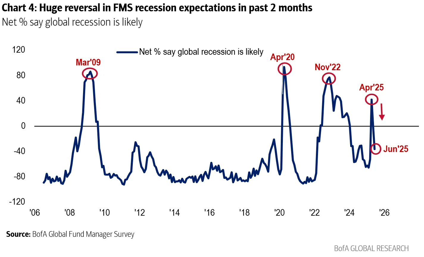 以色列發動襲擊之際,投資者剛剛重拾信心。基金經理調查顯示,近月來對經濟衰退的預期出現了顯著逆轉。有理由認為這幾乎完全歸功於"解放日關税”,以及市場隨後認為美國將徹底取消這些關税的預期: