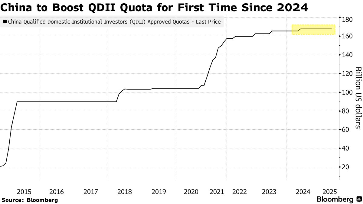 所謂QDII計劃允許符合特定條件的基金在獲批額度內投資境外證券。北京嚴格控制該計劃以管理資本外流並緩解人民幣壓力。當前額度為1677.9億美元。