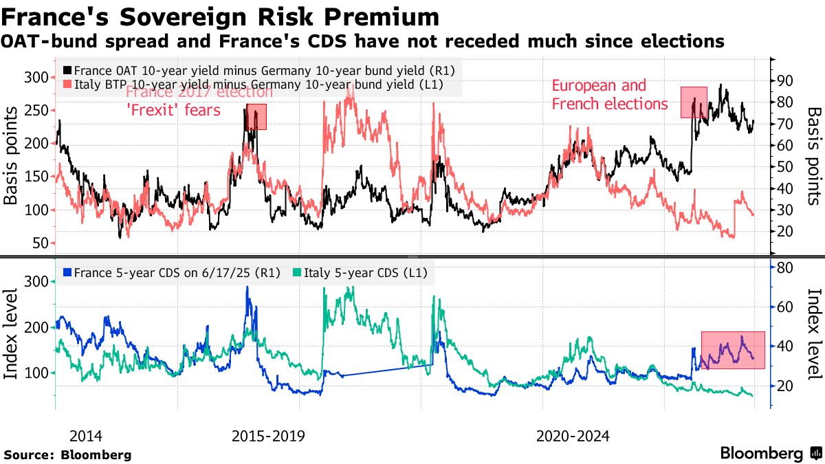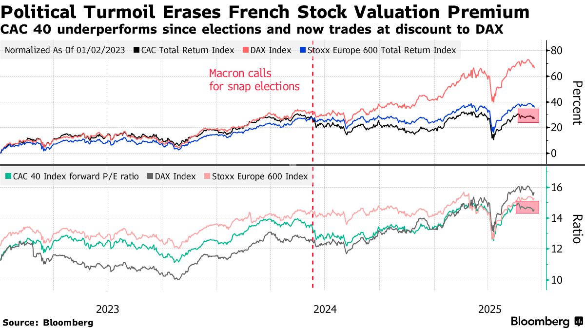 去年六月的突然選舉使法國陷入懸峙議會和政治不穩定的局面,阻礙了將預算赤字降至歐盟限制的努力。在政府債券市場,法國的表現遠遠落後於德國,因為投資者要求更高的補償以應對風險。