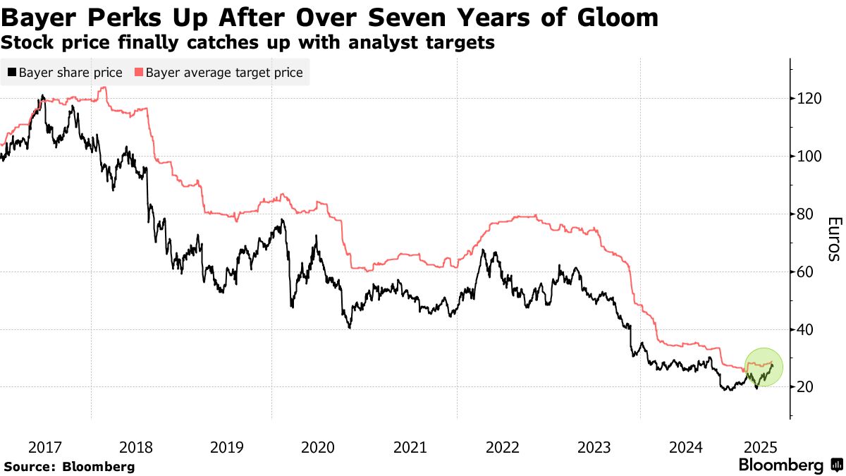 儘管今年有所回升,拜耳股價仍遠低於歷史高位。該公司為應對農達索賠預留的160億美元已支付約100億美元,2018年收購孟山都的交易現被視為災難性大型併購的典型案例。去年該股暴跌約42%,跌幅居DAX成分股之首。