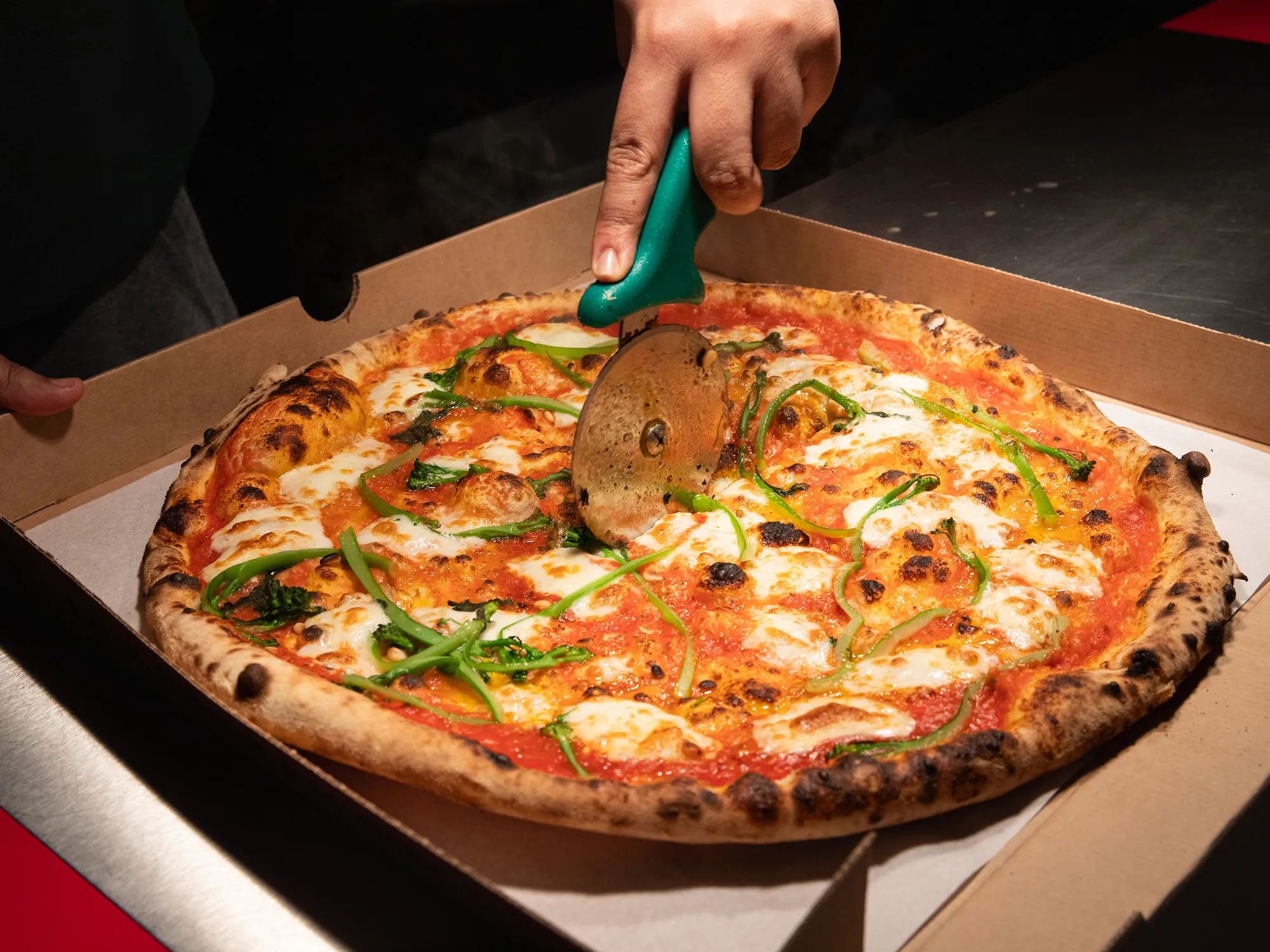 在Yard Sale Pizza伯蒙齊分店切開那份點綴着西蘭花的TSB披薩。攝影師:Clay Williams,為《彭博追求》拍攝點單推薦: “茄子披薩”,以蒜香烤茄子的柔嫩切片為特色,配以酥脆辛辣的帕爾馬乾酪碎(12英寸13.50英鎊;18英寸25.50英鎊)。對於醃製肉類愛好者來説,“邪惡辣香腸披薩"正如其名,鋪滿香脆的辣香腸片並淋上熱蜂蜜(16/30英鎊)。