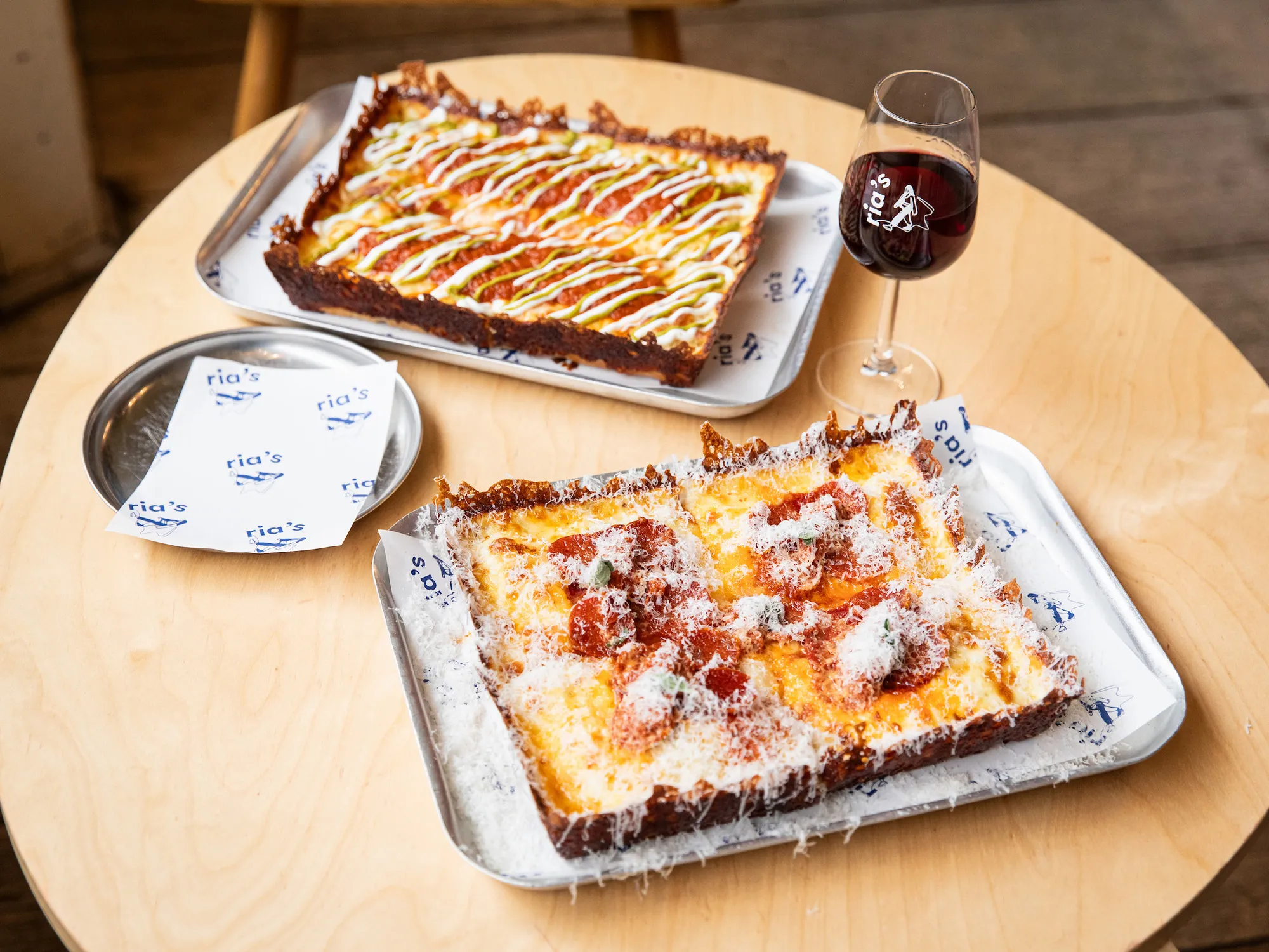 在諾丁山,莉婭餐廳提供奶酪外皮的底特律風格方形披薩,包括他們的招牌披薩、辣香腸和索普拉薩塔披薩。攝影師:克萊·威廉姆斯,為《彭博追求》拍攝拉特克利夫採用多種麪粉製作出如佛卡夏麪包般蓬鬆的餅底,其中包括其故鄉科茨沃爾德磨製的麪粉。餅底底部酥脆且略帶油香,邊緣直至蕾絲狀餅皮處都裹着更酥脆的芝士外殼——這歸功於馬蘇裏拉與少量切達乾酪的混合使用,此舉致敬了原版常用的威斯康星磚塊芝士。他的番茄醬濃郁醇厚,散發着牛至香氣,在辣香腸和意式辣腸披薩(整份23英鎊或單片6.5英鎊)等豐盛款式中表現尤為出色。Ria餐廳知名度正不斷提升,每週售出近千份披薩,並計劃開設新店,具體選址尚未確定。