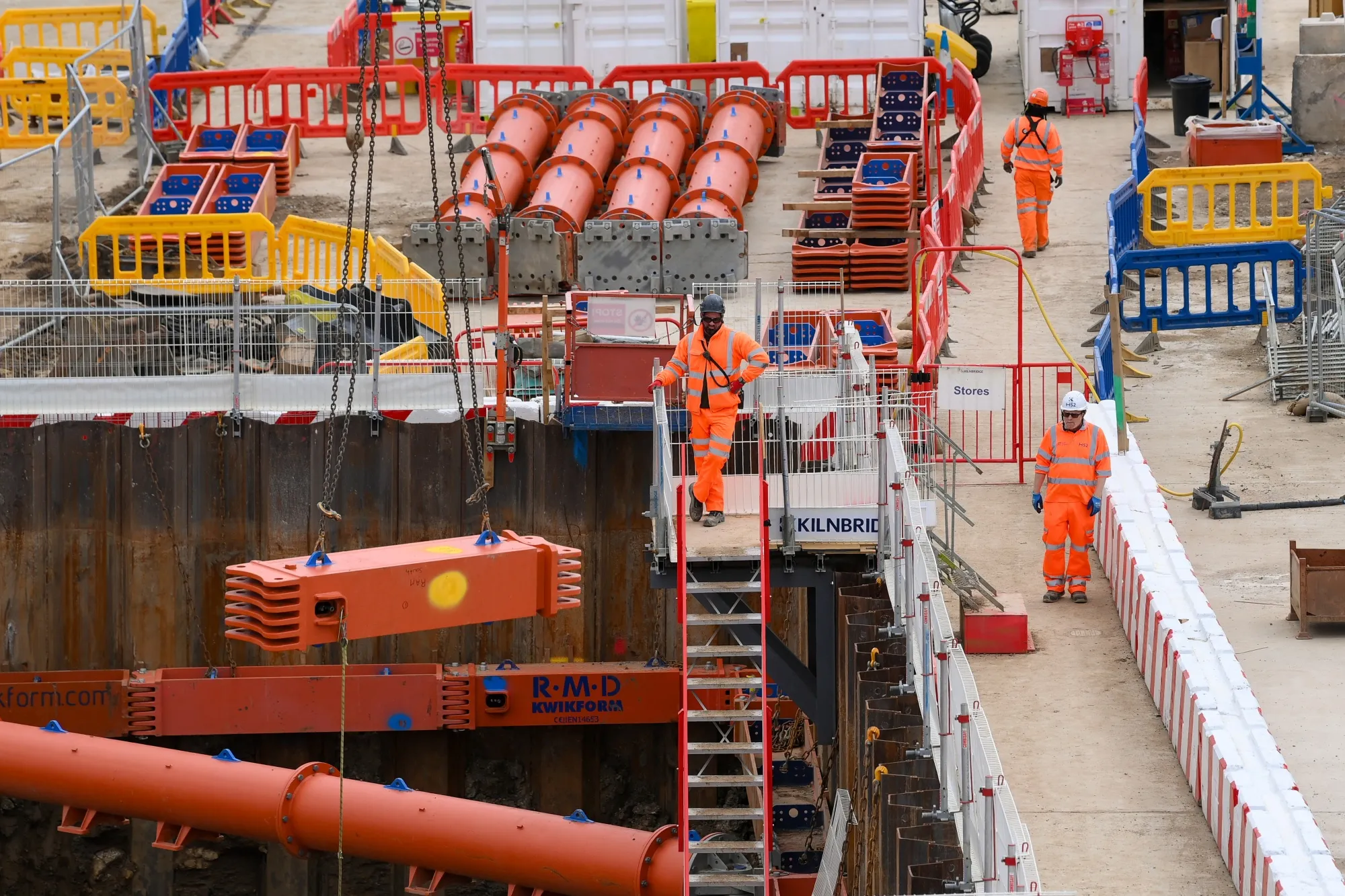 倫敦HS2高鐵建設工地的工人們。攝影師:Jaimi Joy/彭博社英國政府即將宣佈,高速鐵路2號線(HS2)的完工將延期且成本上升,並指責前保守黨政府在這個問題重重的項目上浪費了數十億英鎊。