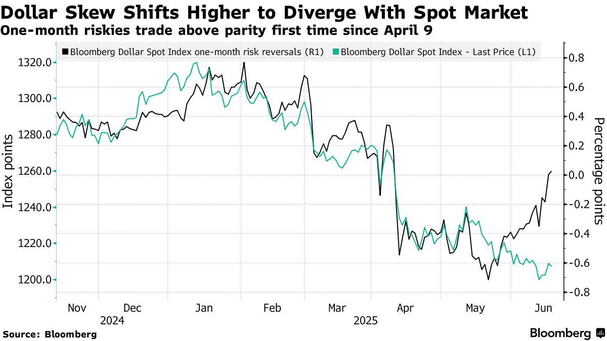 與此同時,下月期權市場的情緒轉向樂觀,風險逆轉指標顯示交易員自四月以來首次放棄看跌押注。原因在於以色列與伊朗衝突升級推高原油價格,而美國作為原油淨出口國的地位間接支撐了美元。