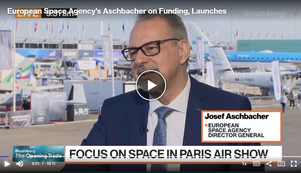 歐空局局長約瑟夫·阿施巴赫週二在巴黎航展向彭博電視台的蓋伊·約翰遜表示,由於預算限制難以跟上美國步伐,歐洲需要"加強"航天資金投入。