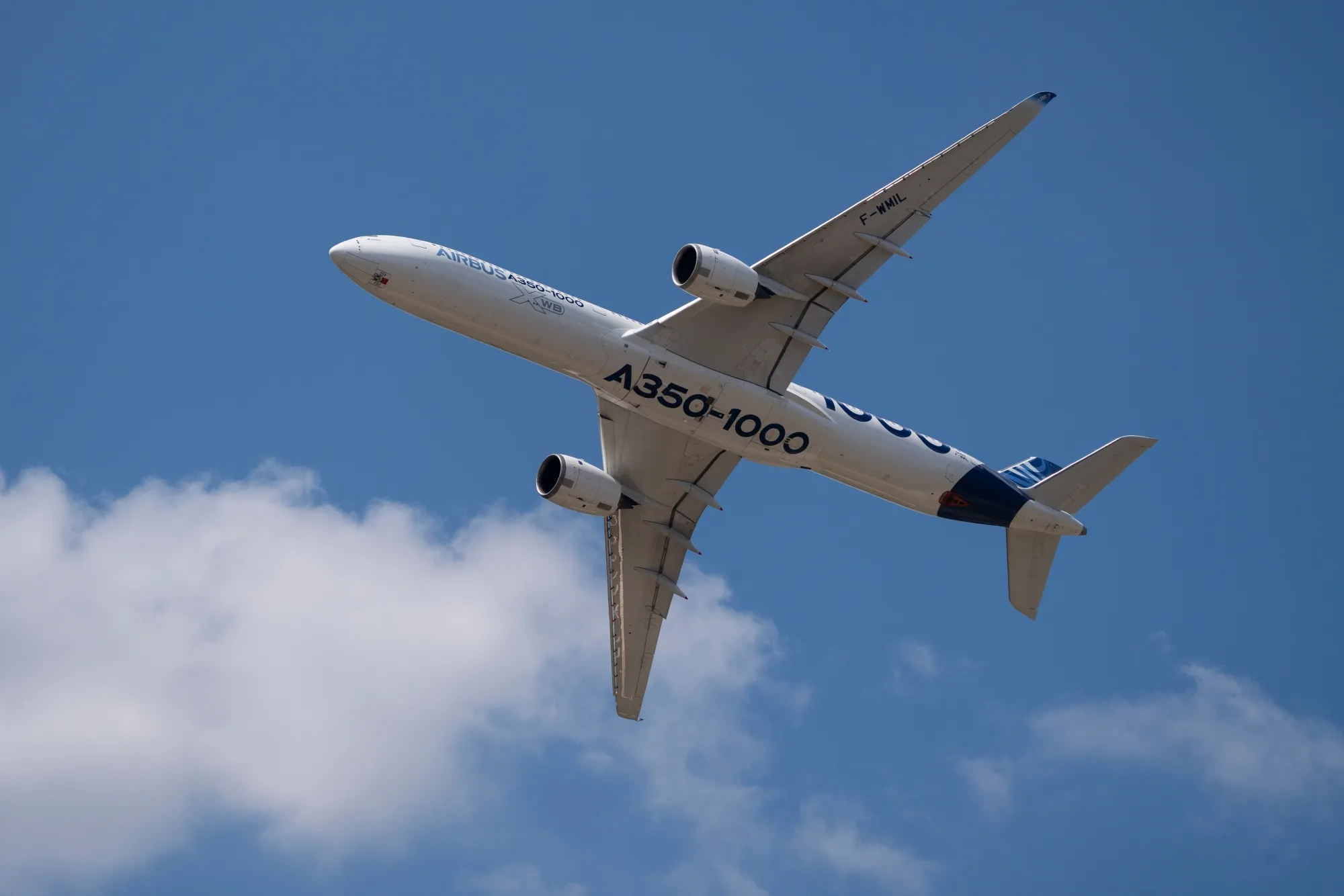 巴黎航展上的空客A350-1000客機。攝影師:Nathan Laine/彭博社空客集團以斬獲更多先進A350機型訂單為巴黎航展收官,在長期競爭對手波音公司因航展前數日發生致命空難而推遲所有發佈後,實現了全面勝利。