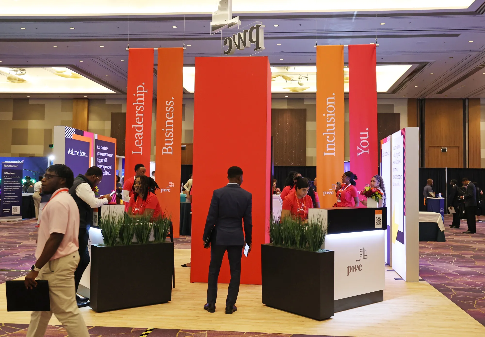 普華永道展台上寫着"領導力·商業·包容性·你"的橫幅。攝影師:朗達·丘吉爾企業僱主們——尤其是德勤、安永、畢馬威和普華永道這"四大"會計審計機構——正面臨兩難境地:既要應對美國日益嚴峻的會計師短缺問題,又要滿足聯邦政府對多元化項目新近的牴觸態度。