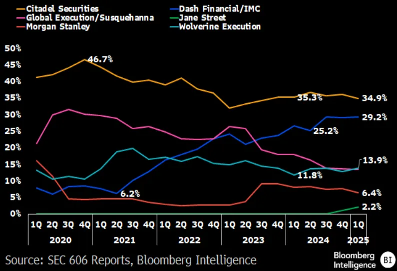 該公司曾是最後一家仍在為期權訂單流支付零售經紀商費用的大型銀行,而這一業務現在主要由高頻交易機構主導。彭博智庫對監管文件的分析顯示,摩根士丹利在第一季度做市商此類支付中佔比6.4%,這反映了其市場份額。前四家公司均由Citadel Securities領銜,均為主要自營公司。
