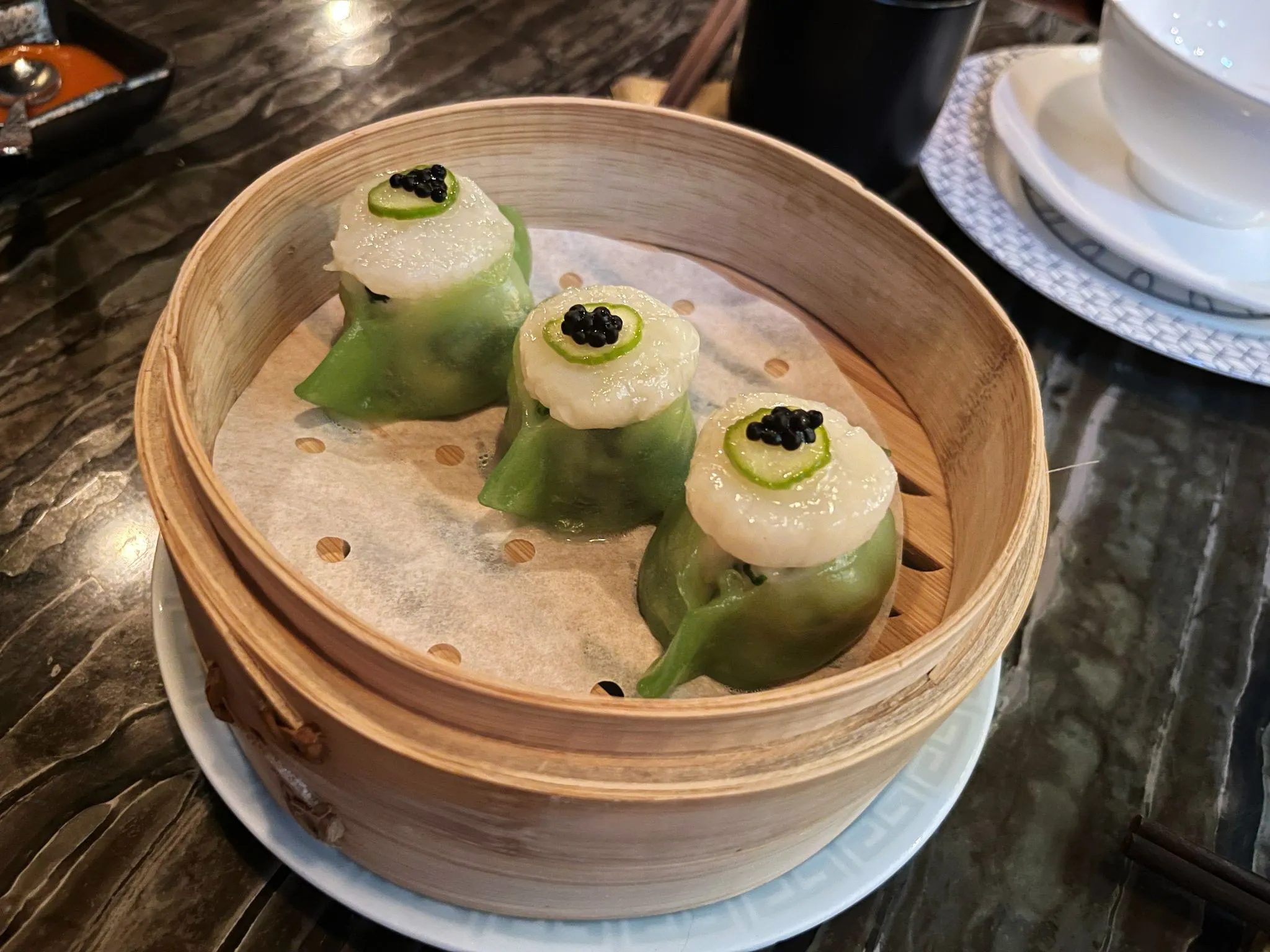 這是我和客人第一次光顧卅二公館。我們選擇了點心菜單,點了幾道經典菜式的變種,包括龍蝦雲南火腿蝦餃(150港元)、海鮮餃(96港元)和蘑菇鹹蛋黃雞肉包(96港元)。我只能説,這家餐廳如此有名是有原因的。香葱北京烤鴨絲春捲(84港元)出奇地新鮮。蝦和扇貝海鮮蔬菜餃不僅美味——它們被精美地設計成綠色小丘,頂部有同心圓裝飾。大龍蝦蝦餃多汁奢華,還配有一小管辣椒油。
